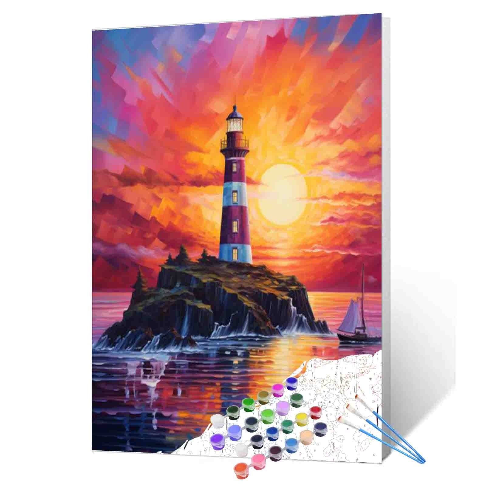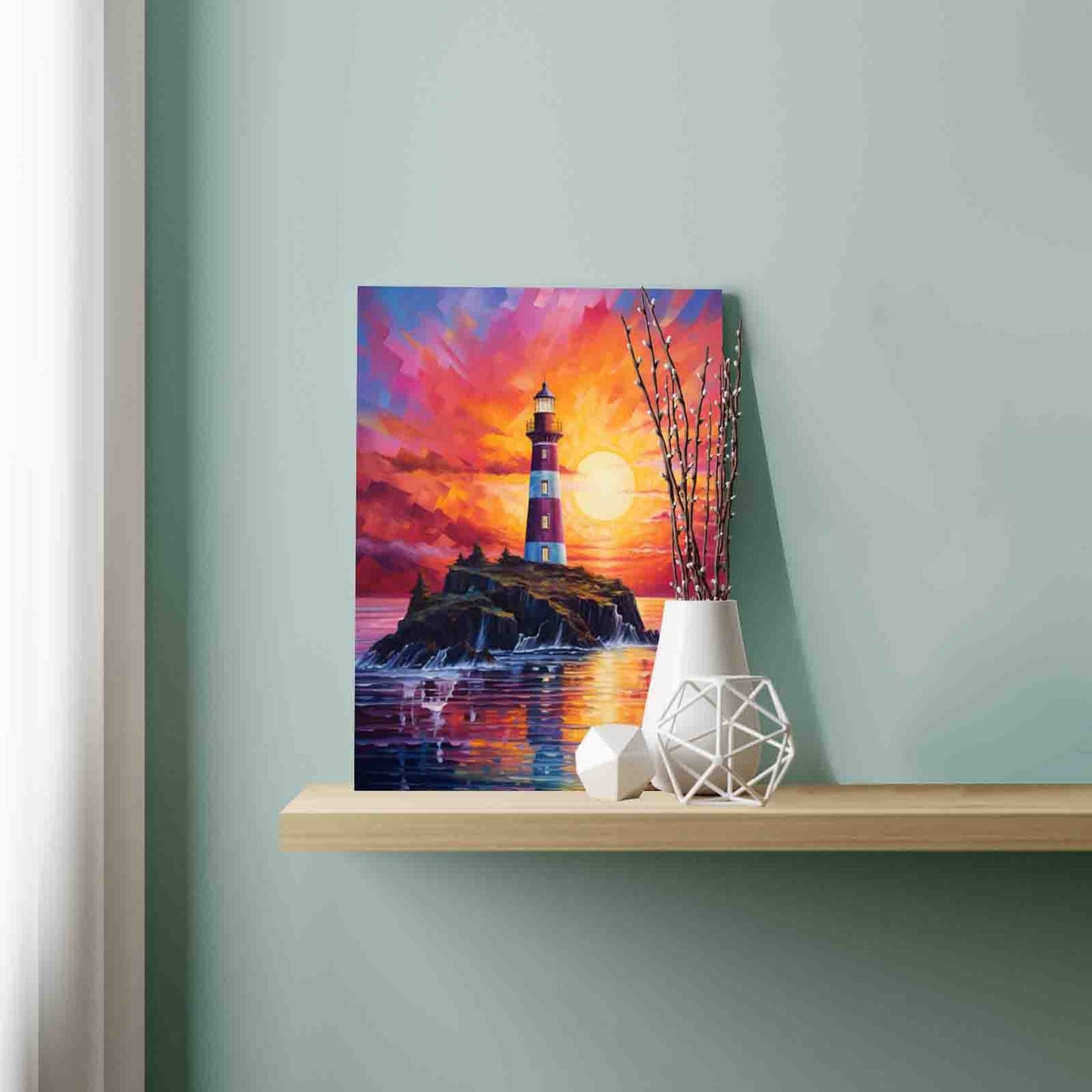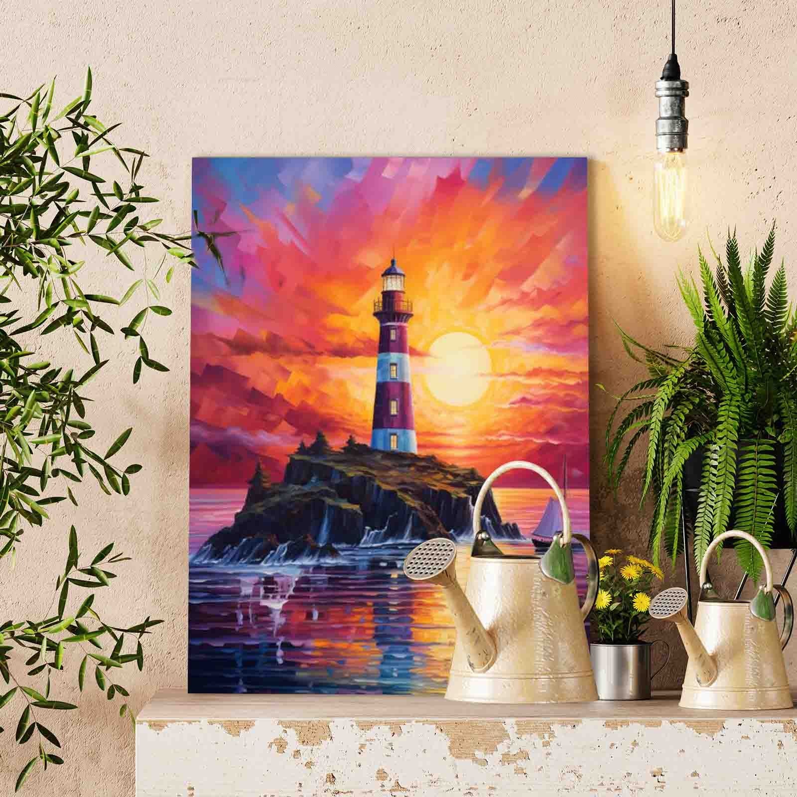 A radiant sun sinks into the horizon, igniting the sky in swirls of crimson, orange, and lavender. Atop a rugged island, a striped lighthouse stands tall, casting its silent watch over the shimmering sea. Waves glisten with mirrored light, painting the surface with streaks of gold and violet. Nearby, a solitary sailboat glides gently, heading toward the glow of evening. The scene captures a peaceful farewell to day—a moment of stillness, guidance, and quiet strength bathed in color. Let every brushstroke lead you through this glowing seascape.
