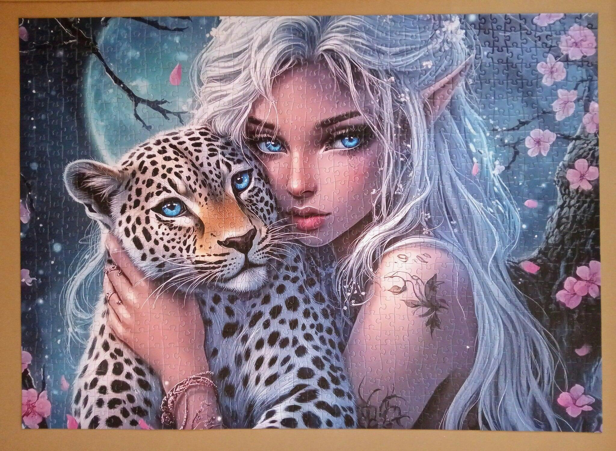 Immerse yourself in a magical night with this enchanting jigsaw puzzle featuring a stunning elf and her loyal leopard companion under the moonlight. The intricate details and mystical atmosphere make this puzzle a captivating challenge for fantasy lovers. With premium-quality pieces that ensure a perfect fit, this 1000-piece puzzle provides hours of relaxing entertainment and a striking piece of art once completed. Perfect for anyone who loves fantasy themes and elegant designs.