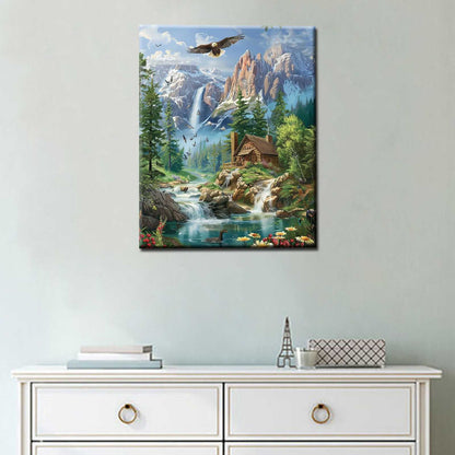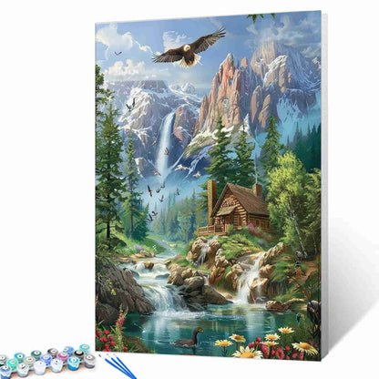 Capture the majesty of nature with our Mountain Cabin and Eagle Paint by Numbers. This scene features a cozy cabin nestled by a flowing creek, surrounded by towering mountains and lush trees. An eagle soars above, symbolizing freedom, while a variety of birds and vibrant flowers enhance this peaceful landscape. A perfect choice for nature lovers seeking a relaxing project.