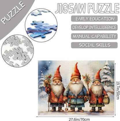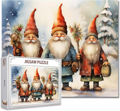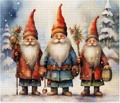 - This festive jigsaw puzzle features three adorable gnomes in their winter attire, standing in a snowy forest. Their cheerful smiles and charming personalities are sure to bring joy to your holiday season. The intricate details and vibrant colors will make this puzzle a delightful challenge for all ages!