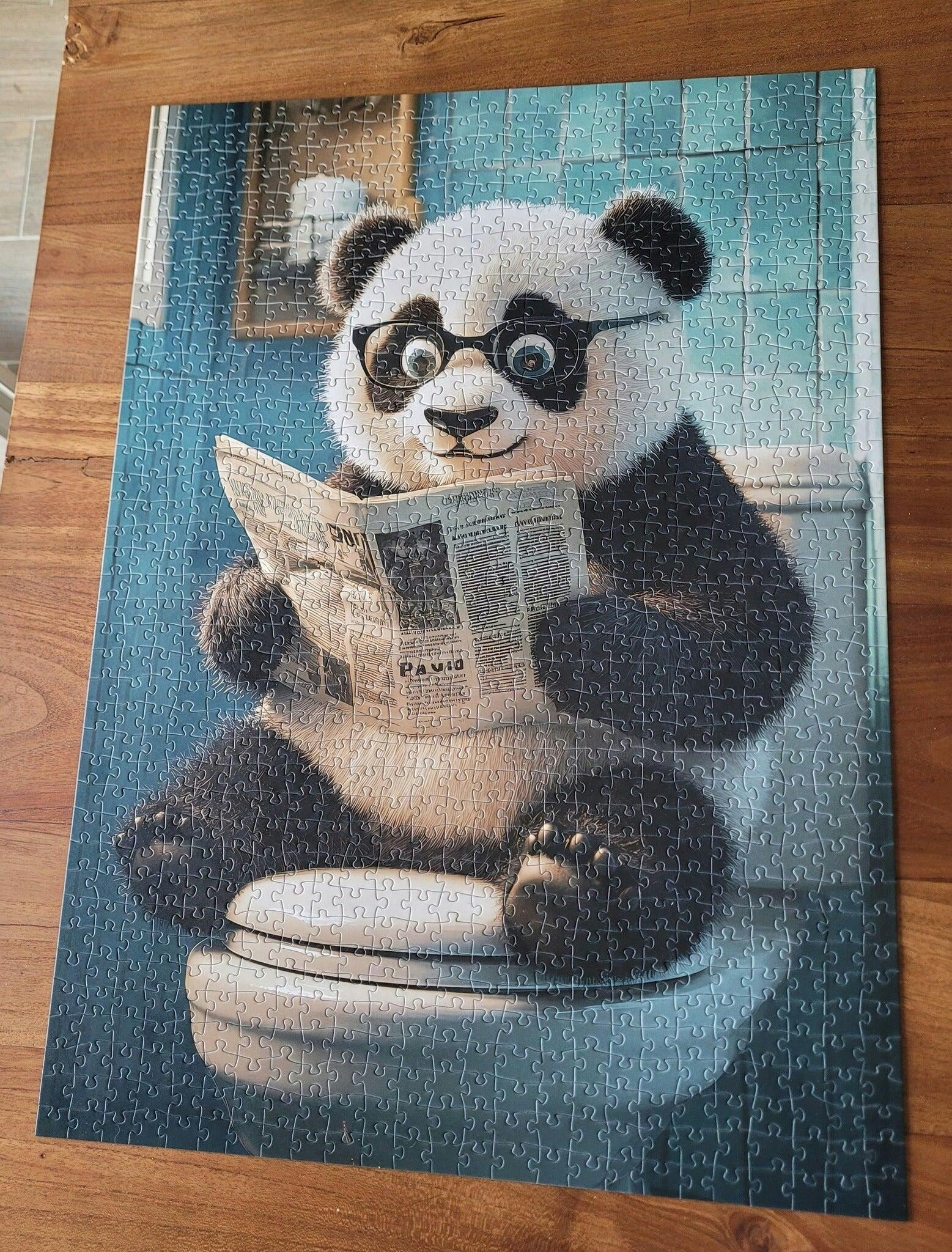 This playful panda, sporting stylish glasses, sits comfortably reading a newspaper in the bathroom. With its adorable expression and fluffy fur, the panda captures a moment of relaxation and curiosity. The bright blue tiles and cozy setting create a peaceful atmosphere as the panda enjoys its quiet time. This jigsaw puzzle offers a fun challenge, bringing together charming animal imagery and a lighthearted moment that will bring a smile to your face as you piece it together.