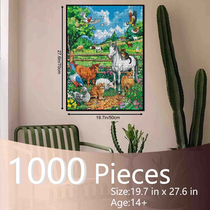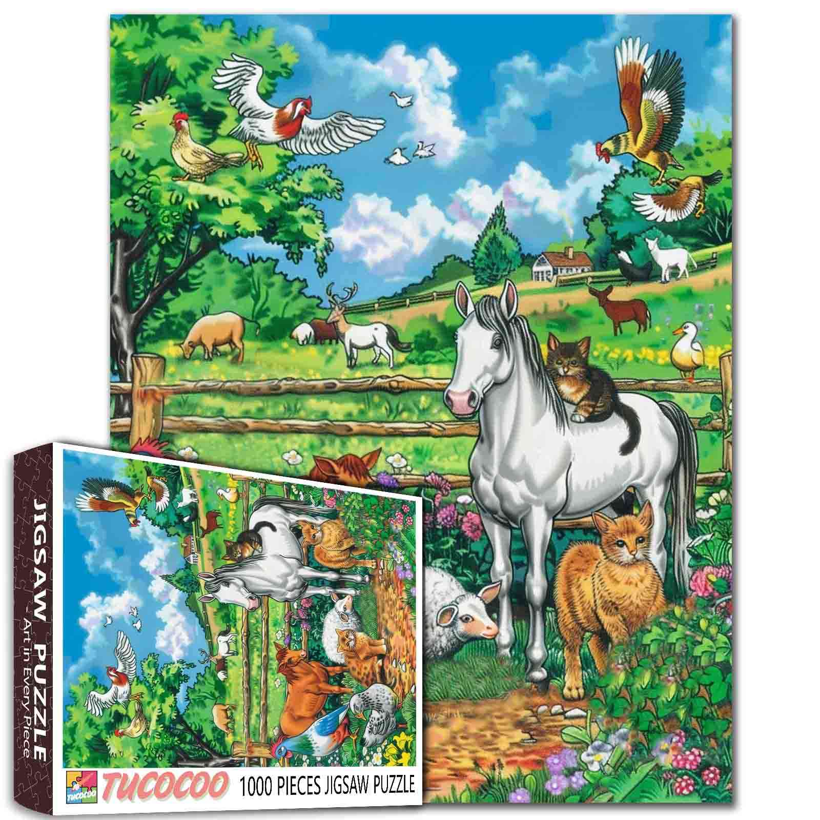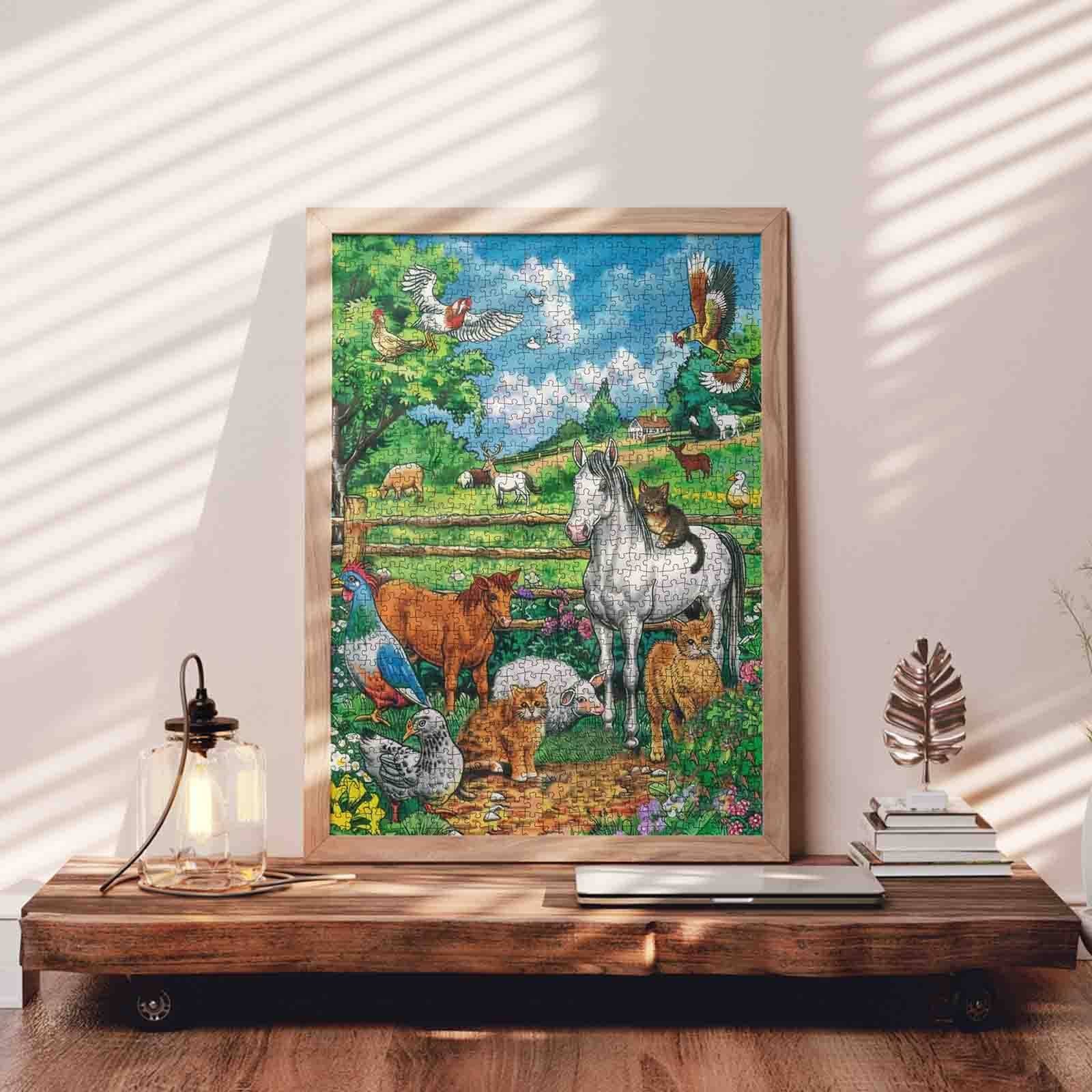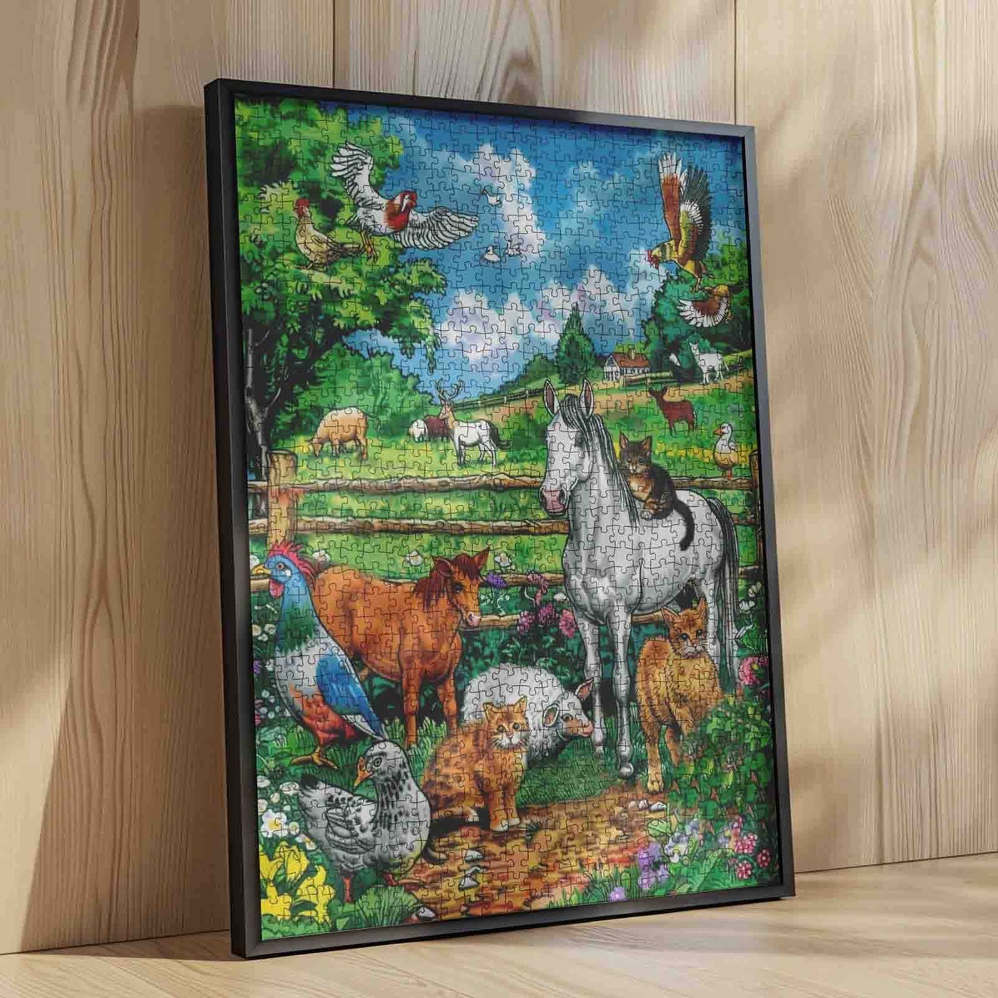 A bright morning unfolds across a joyful farmyard, where cats lounge on a white horse, hens flap through the trees, and goats, cows, and sheep graze in harmony. In the distance, a charming farmhouse completes the tranquil scene. From the playful foal to the watchful birds above, every detail radiates warmth and simplicity. This puzzle is a cozy escape into countryside life, full of cheerful animals and calm green pastures that invite you to slow down and savor each piece.