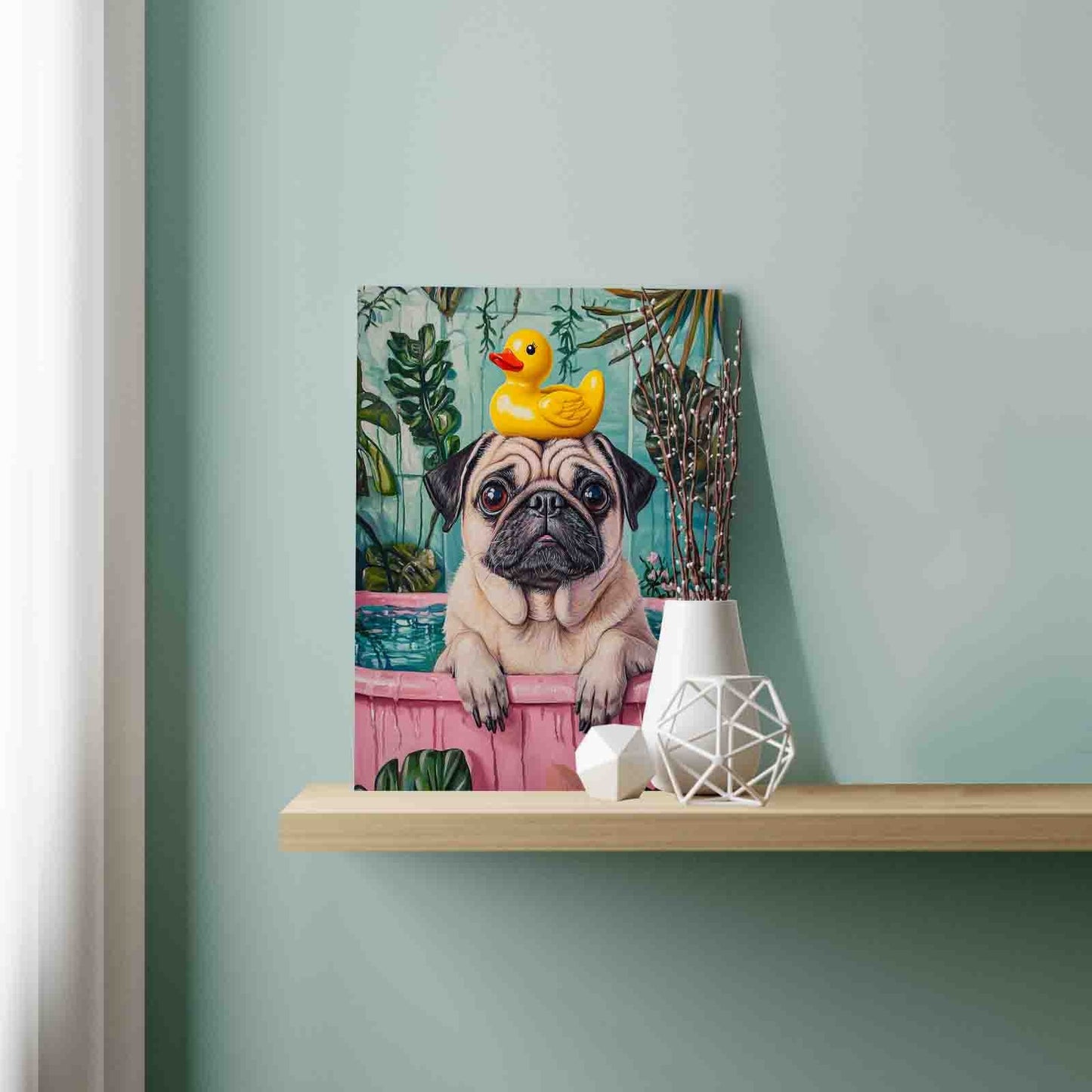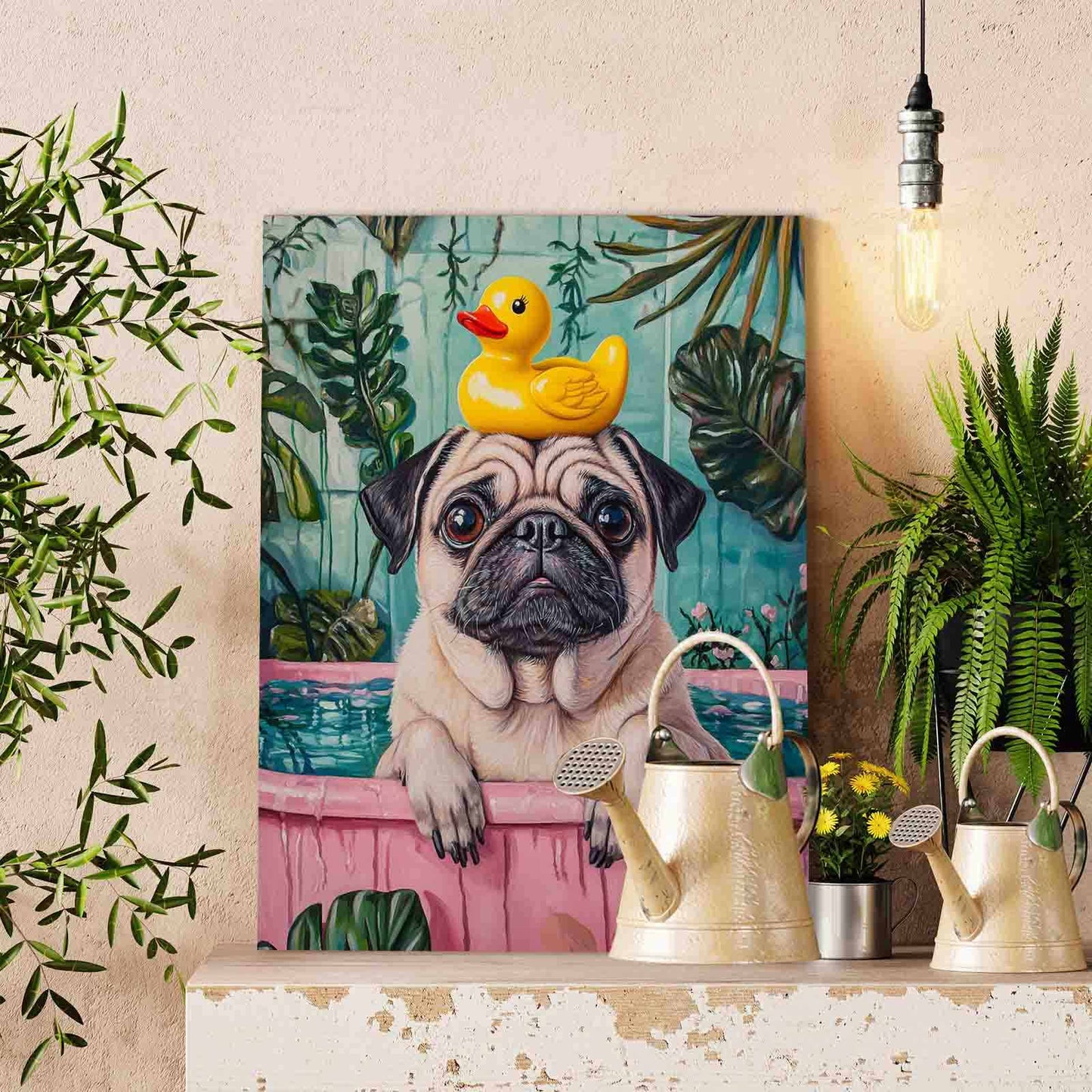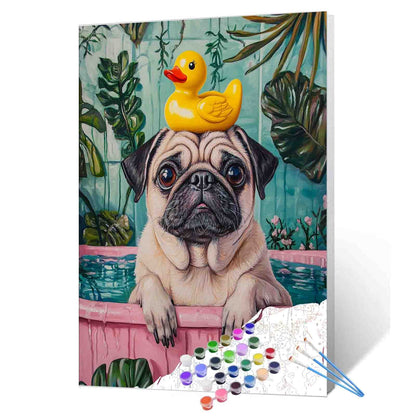 Perched in a pink tub with a yellow rubber duck resting on its head, the wide-eyed pug exudes both patience and confusion. Tropical leaves surround the scene, adding a quirky jungle spa atmosphere. Painting this adorable bath moment captures the charm and humor of canine personality with every brushstroke.