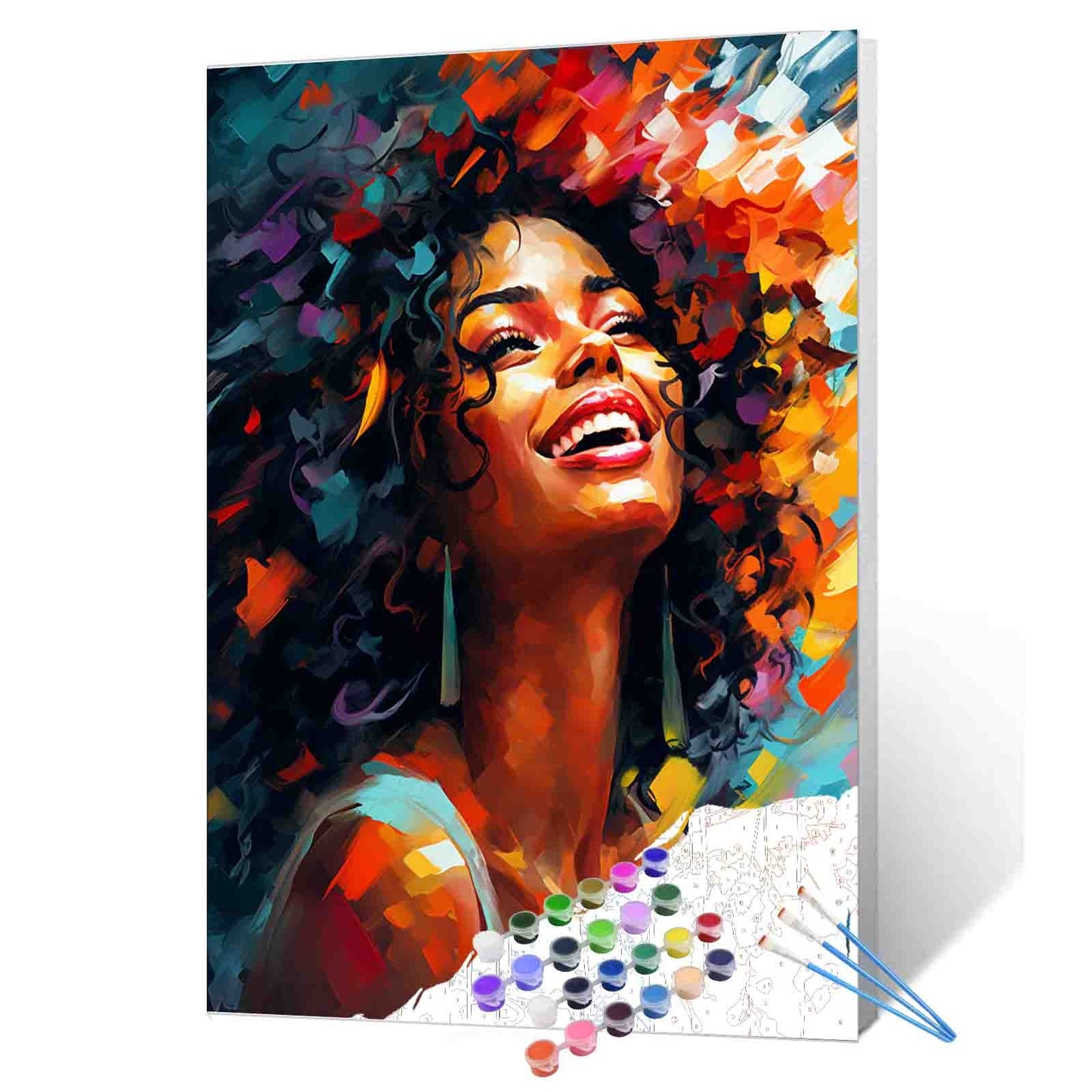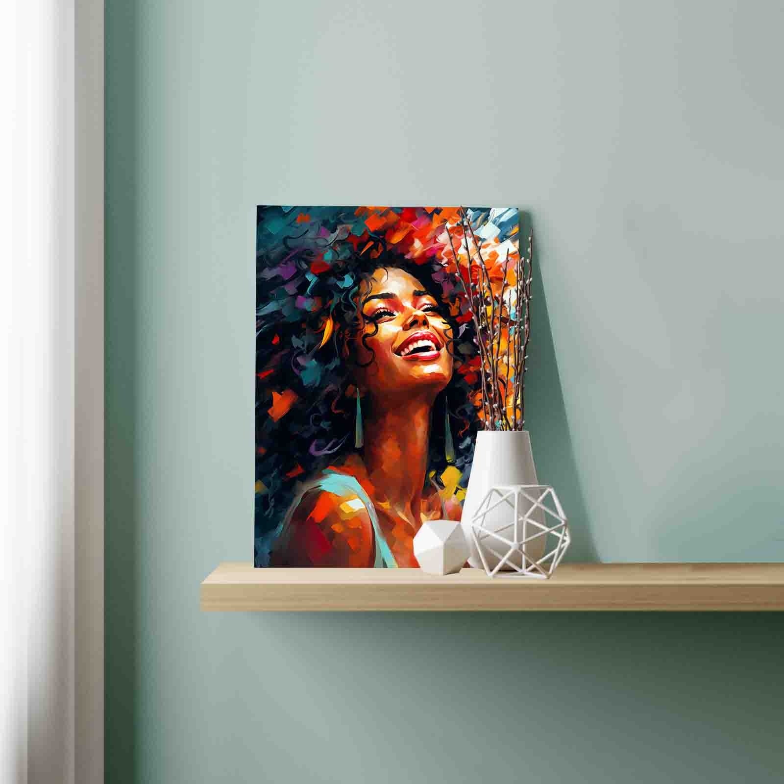 Sunlight dances across her face as she tilts her head back, lost in pure, unfiltered joy. Her curls burst into a whirlwind of vibrant colors—orange, crimson, teal, and gold—echoing the energy she radiates from within. Every brushstroke captures a moment of fearless happiness, a celebration of life’s vivid highs. With her wide smile and glowing expression, this artwork invites you to paint not just a portrait, but a feeling—of light, warmth, and unstoppable spirit.