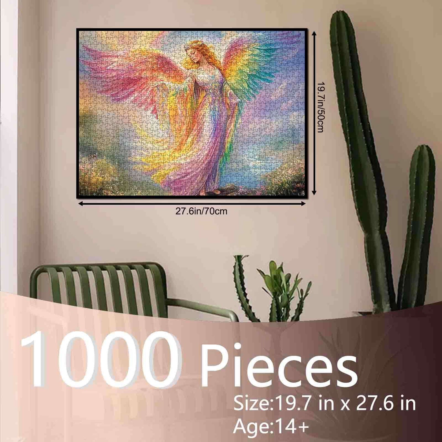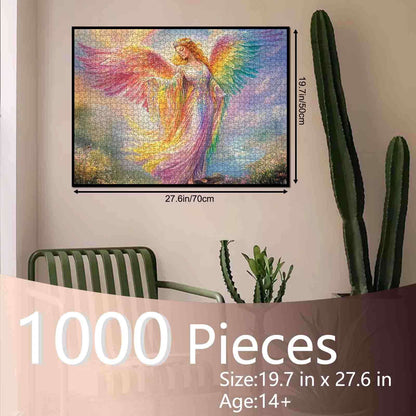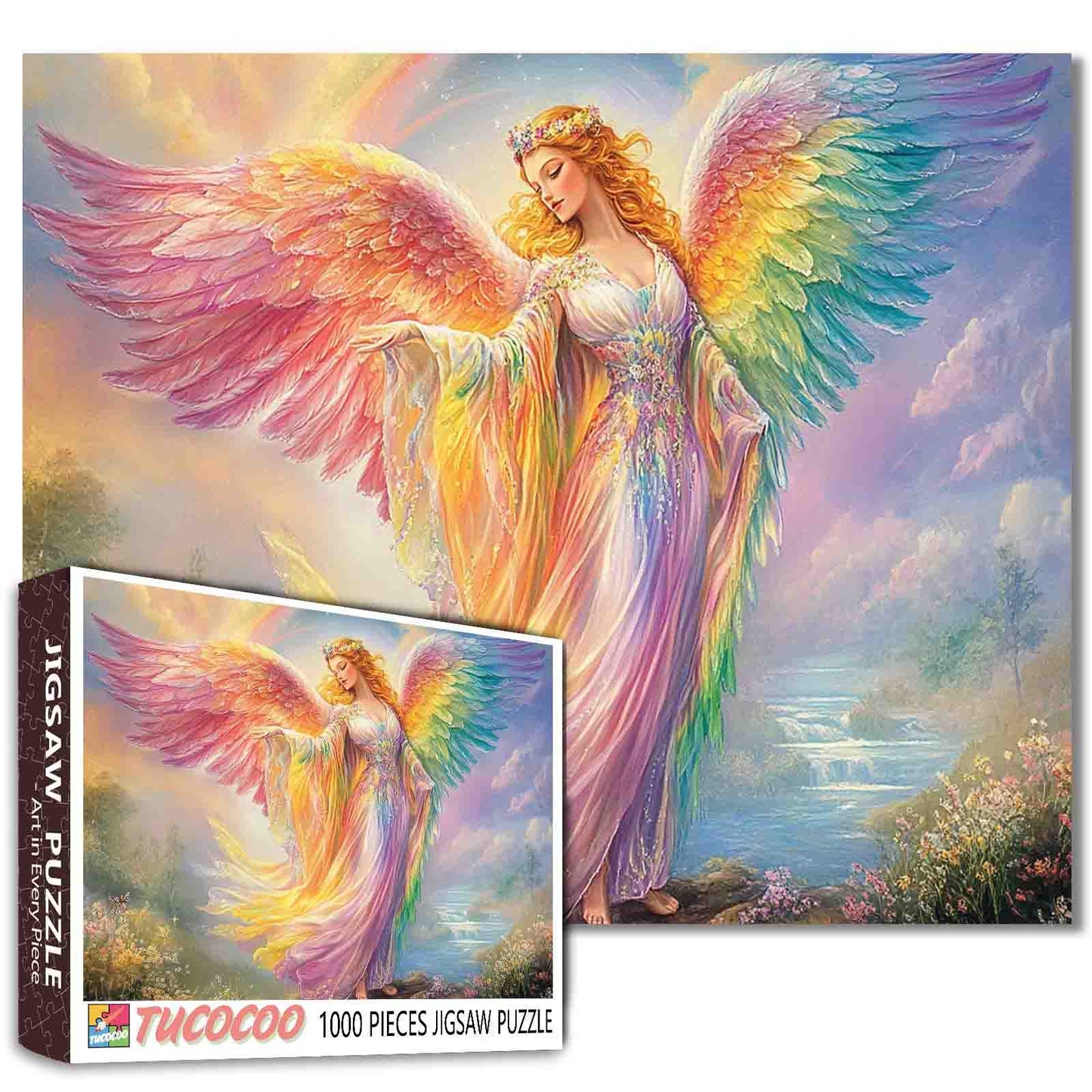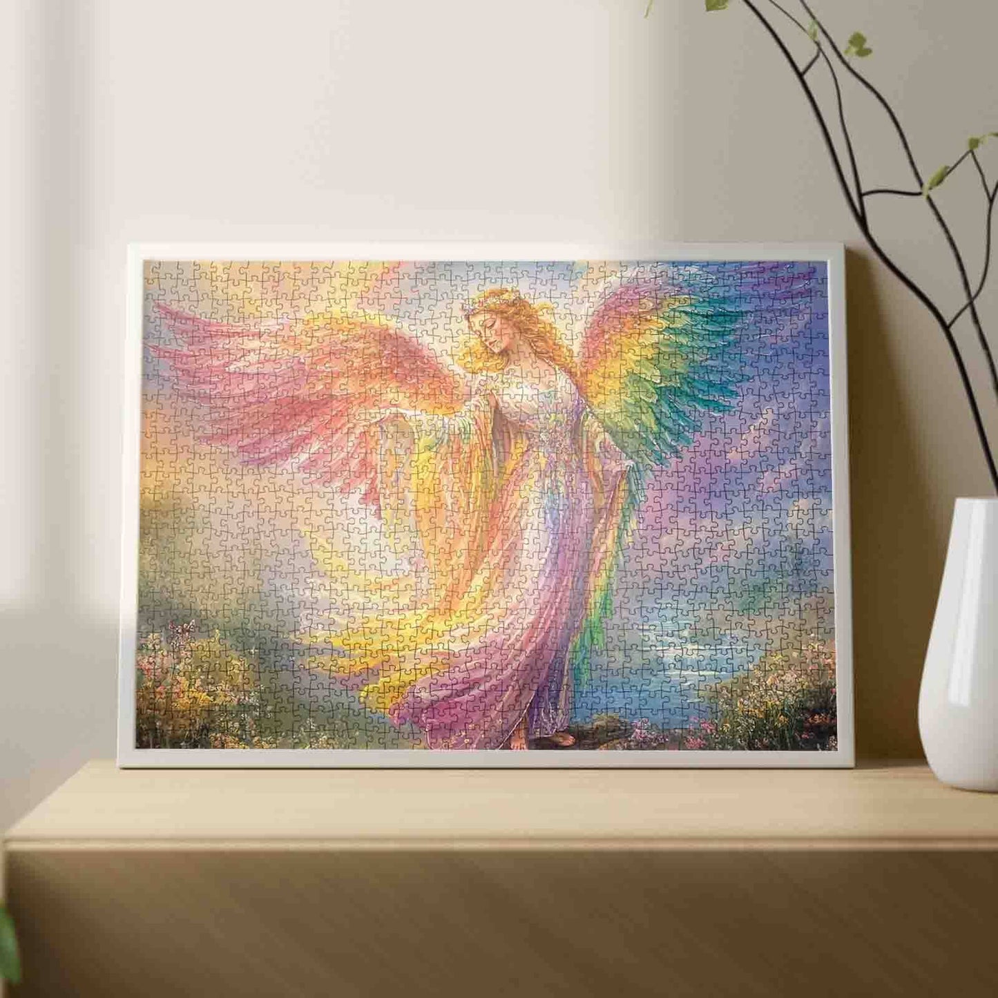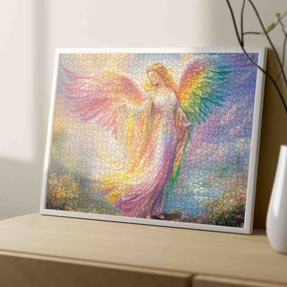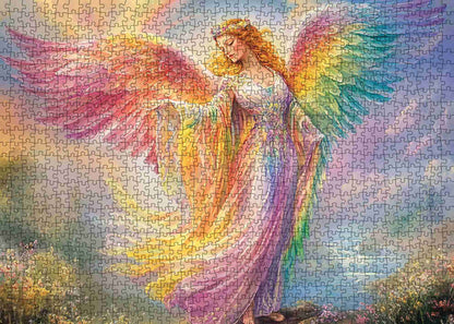 A graceful angel stands on a misty hillside, her flowing gown blending with the hues of dawn. With wings outstretched in radiant colors—fiery red, soft pink, sunny yellow, vivid green, and deep blue—she seems to embrace the sky itself. Her golden hair glows in the morning light, and a crown of blossoms rests gently on her head. The entire scene feels like a vision of hope and peace, painted in the palette of dreams. Putting this puzzle together is a journey into a moment of serenity where colors sing and the spirit soars.