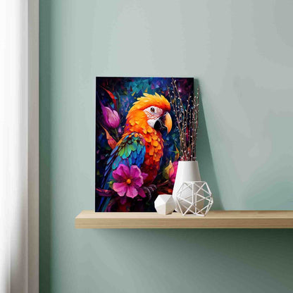 The majestic macaw perches proudly among vivid tropical flowers, its feathers shimmering in every hue of the rainbow. Behind it, a dreamy mosaic of deep purples and blues creates a mystical jungle ambiance. Painting this scene feels like taming wild color itself, blending nature’s brilliance with an exotic twist that ignites the imagination.