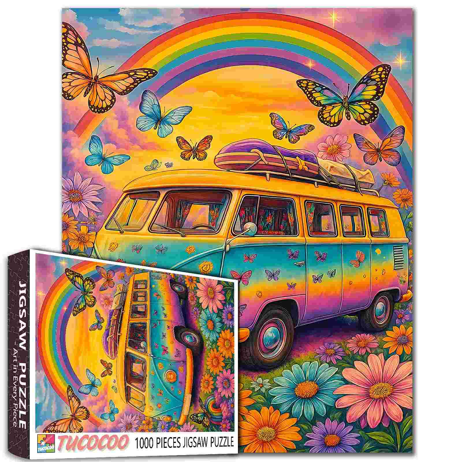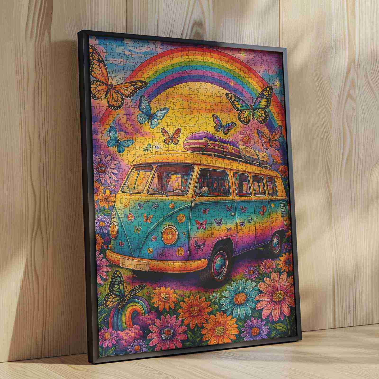 A retro van, bursting with color and covered in butterflies, rests in a magical meadow of blooming flowers. A bright rainbow arcs across the sky as butterflies dance in the golden sunlight, their wings shimmering like jewels. On the roof, surfboards and luggage promise adventure, while every detail—from the flower-covered tires to the swirling sky—radiates freedom and joy. As you piece it together, you’ll feel like you're joining a road trip through a dream world where peace, color, and nature lead the way.