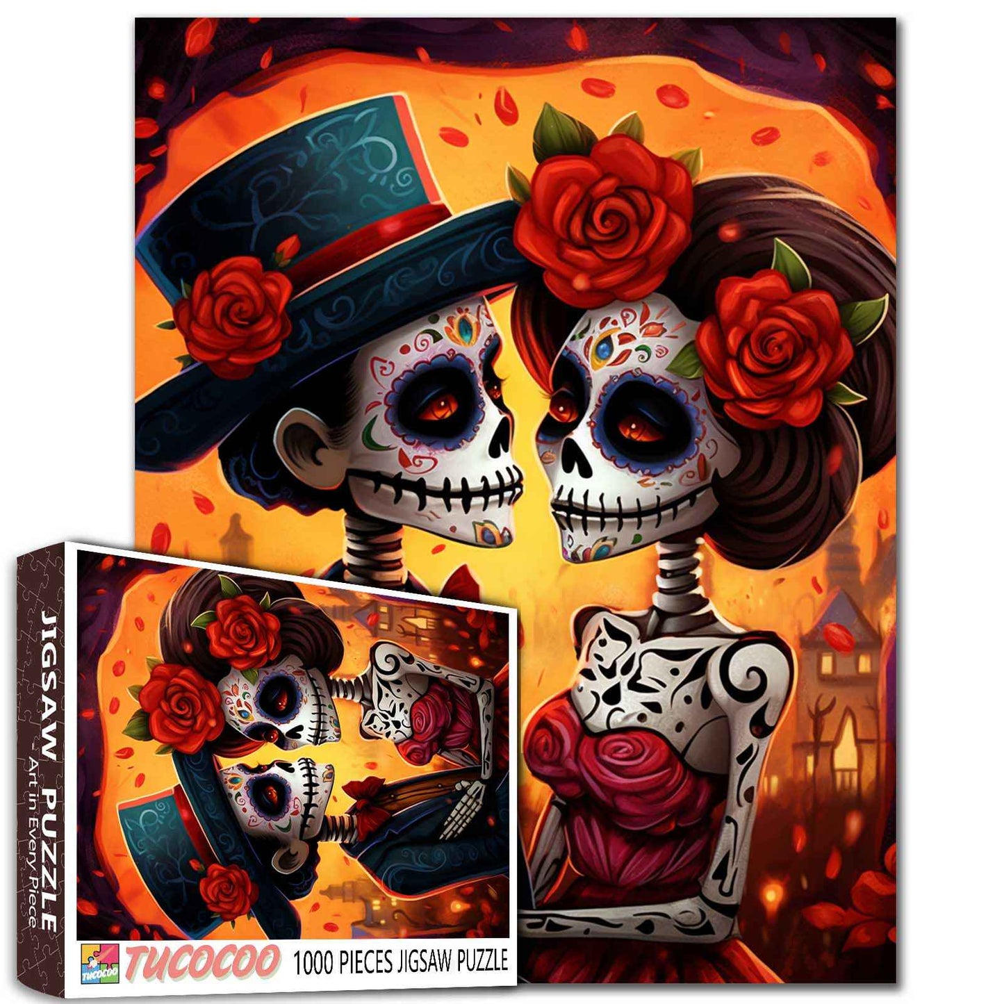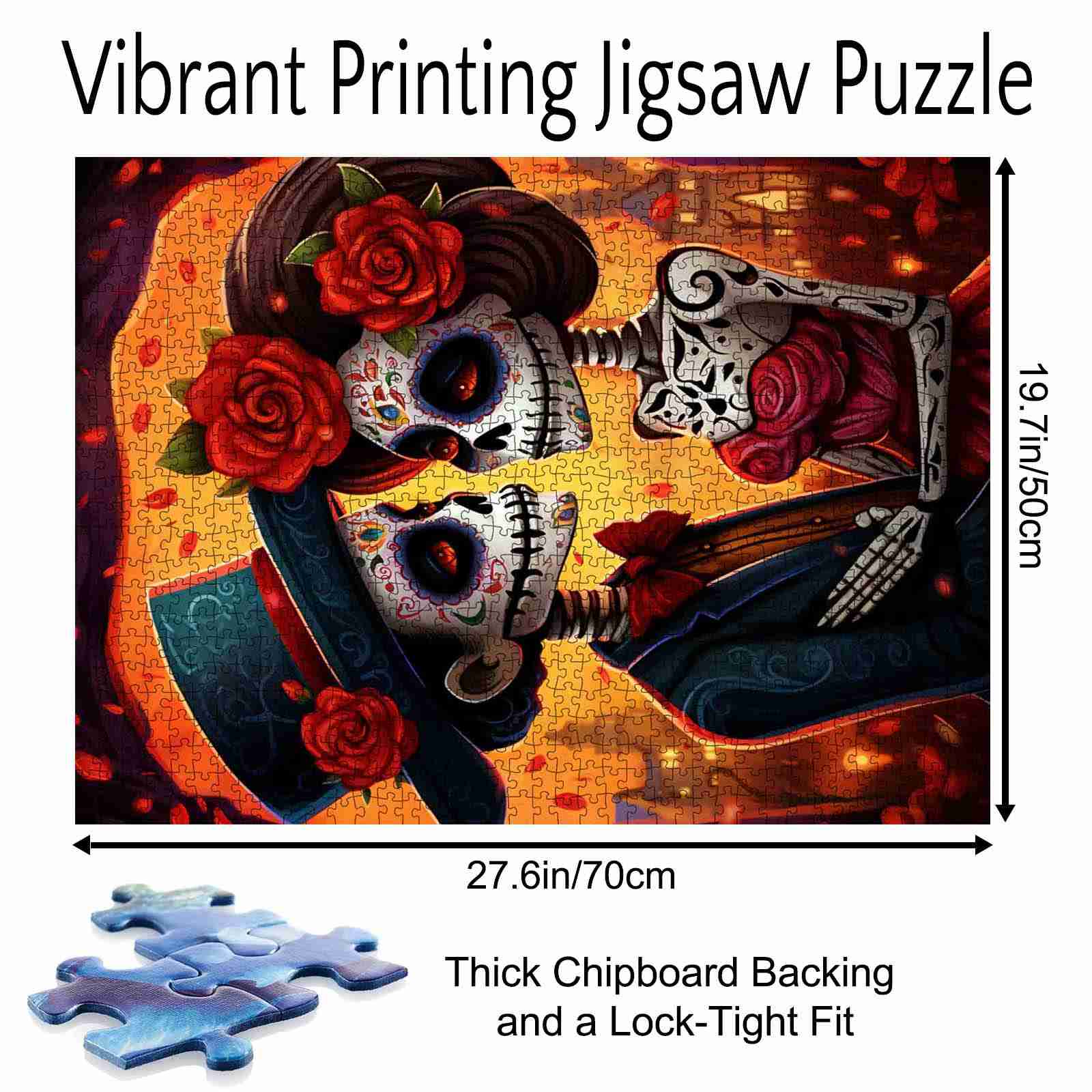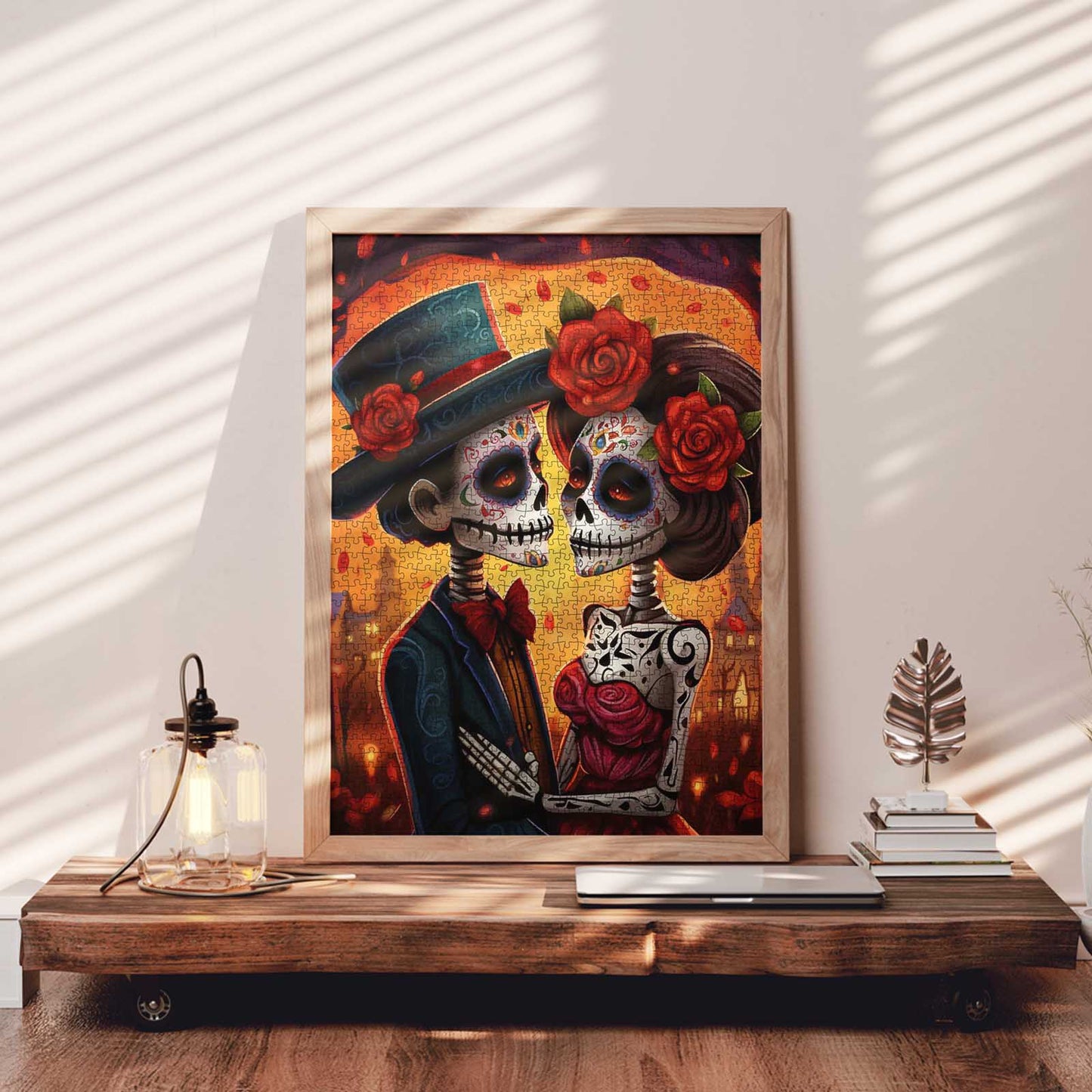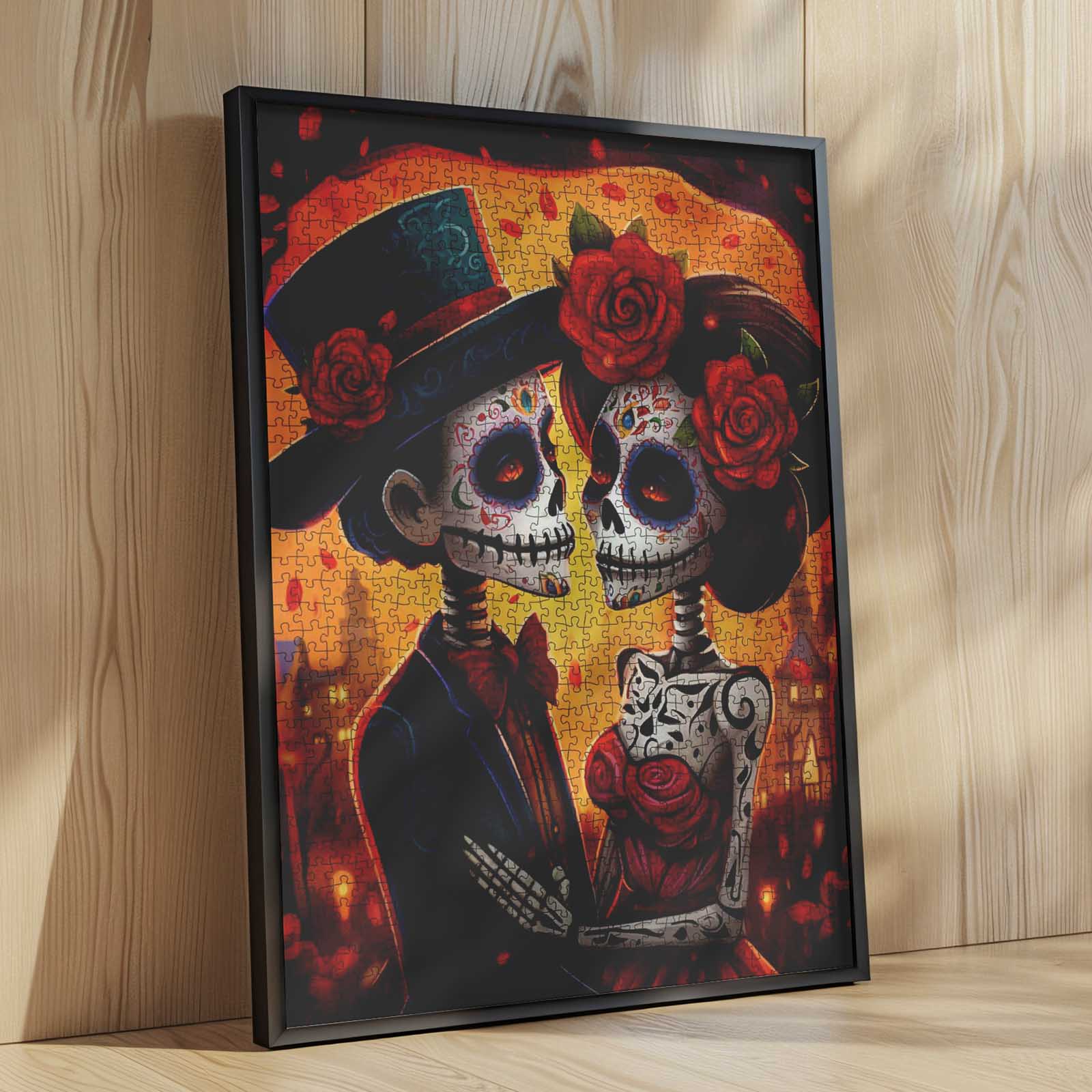 Beneath a golden sky lit with floating petals, a skeleton couple shares a tender gaze. Dressed in vibrant Day of the Dead attire with red roses and elegant clothing, they embody eternal love in a festive spirit. The vivid details and warm tones make this puzzle a perfect celebration of devotion beyond life.