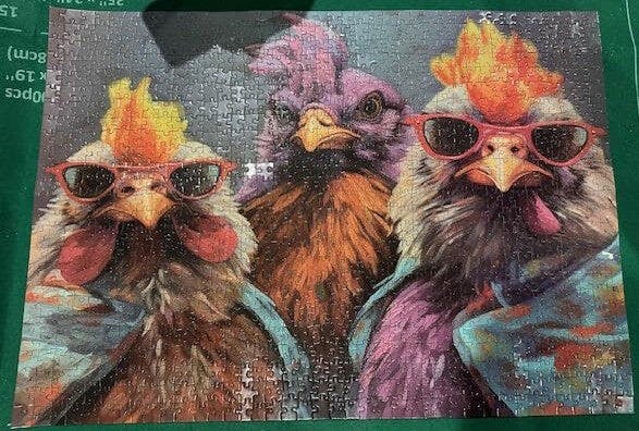 A trio of funky chickens strikes a pose in bold farm fashion—vibrant feathers, fiery mohawks, and retro red sunglasses. Each chicken carries its own quirky personality, making this puzzle a playful journey into barnyard charisma. Against a calm blue backdrop, their vivid plumage and confident stares steal the show. Whether you're a puzzle lover or a fan of eccentric farm art, this design offers both charm and challenge with every piece.