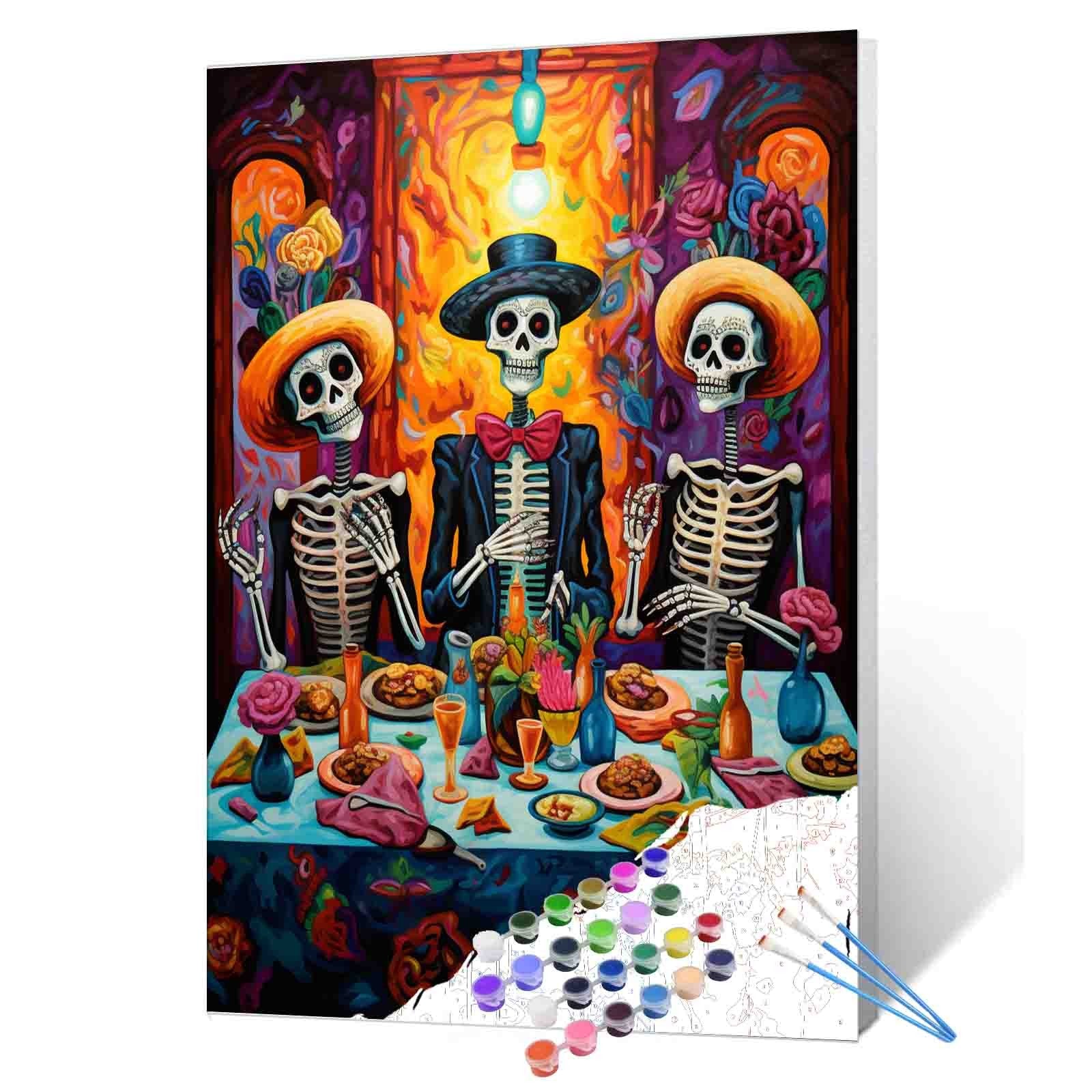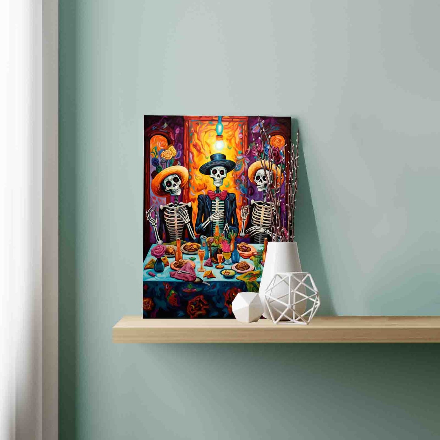 Under the warm glow of a single bulb, three skeletons sit joyfully around a festive table filled with traditional dishes, colorful drinks, and vibrant flowers. Their elegant hats and dapper attire suggest they’ve gathered for a special celebration, perhaps a Día de los Muertos feast to honor loved ones passed. With every brushstroke, the painting invites you into a moment of remembrance and cheer, blending tradition with whimsy. It's a vivid portrayal of life beyond death, filled with warmth, connection, and spirit.