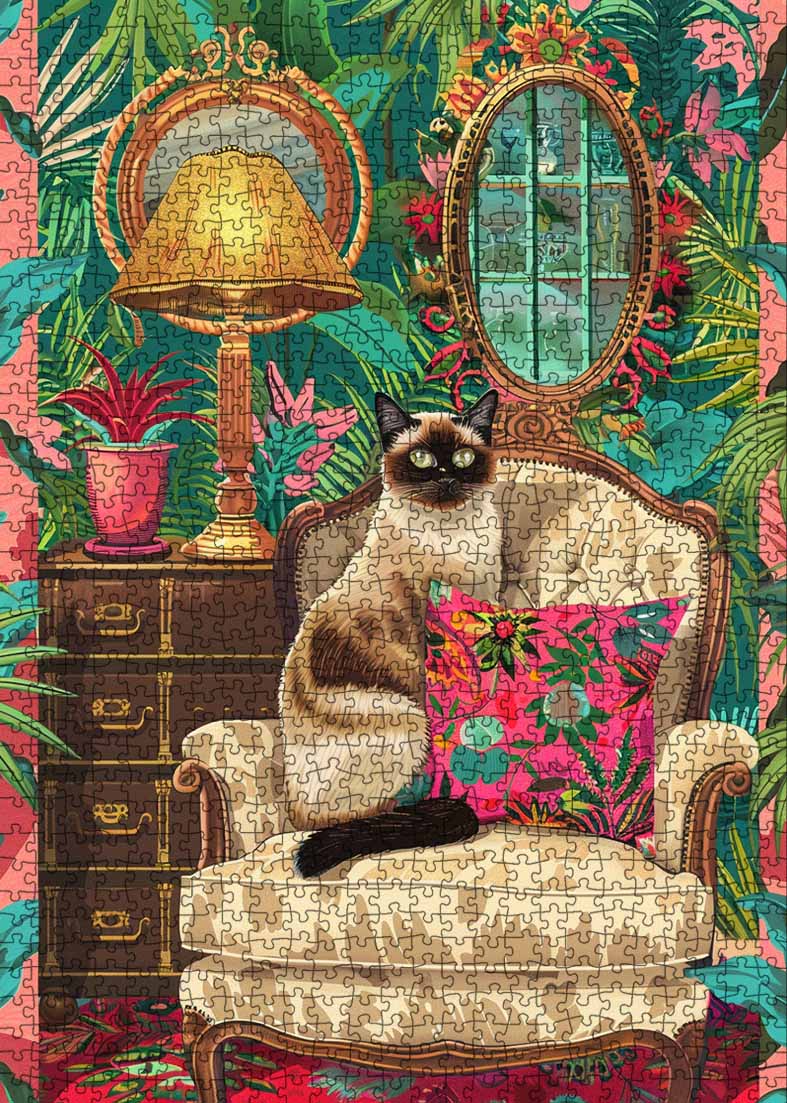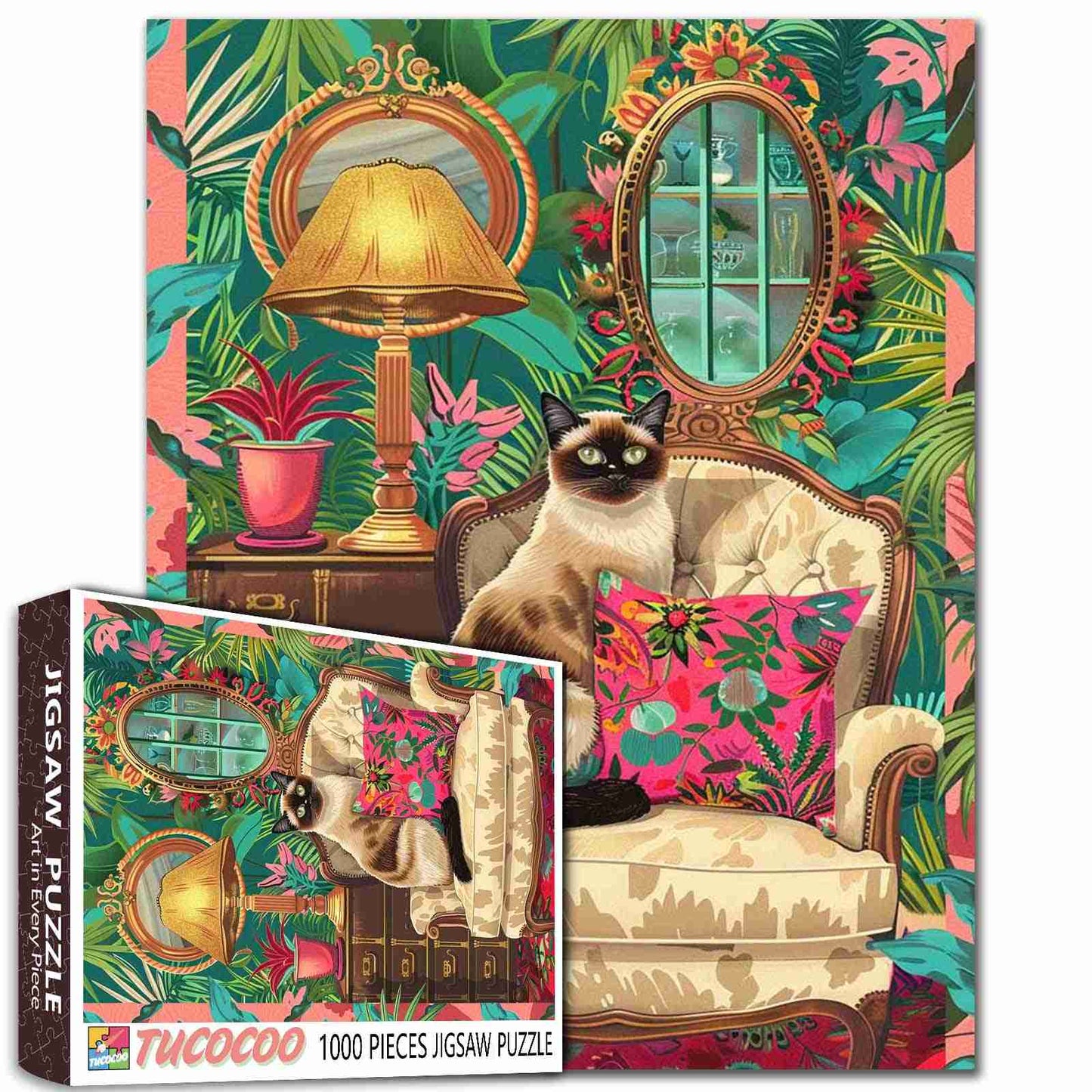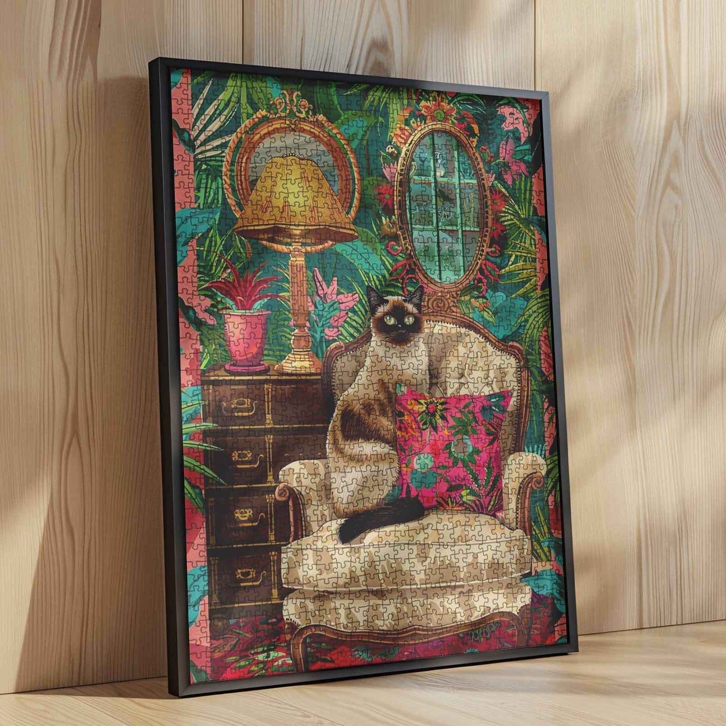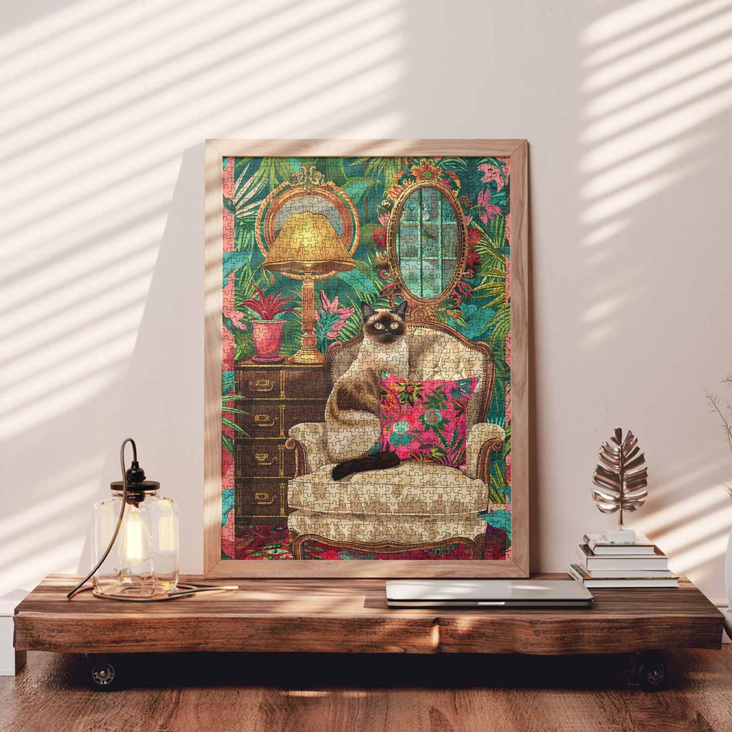 A regal Siamese cat sits gracefully on an ornate armchair, exuding an air of mystery and charm. The tropical backdrop, vintage furniture, and intricate patterns create a scene of refined elegance. Every piece of this puzzle draws you into a world of sophistication, making it a delightful challenge for cat lovers and art enthusiasts alike.
