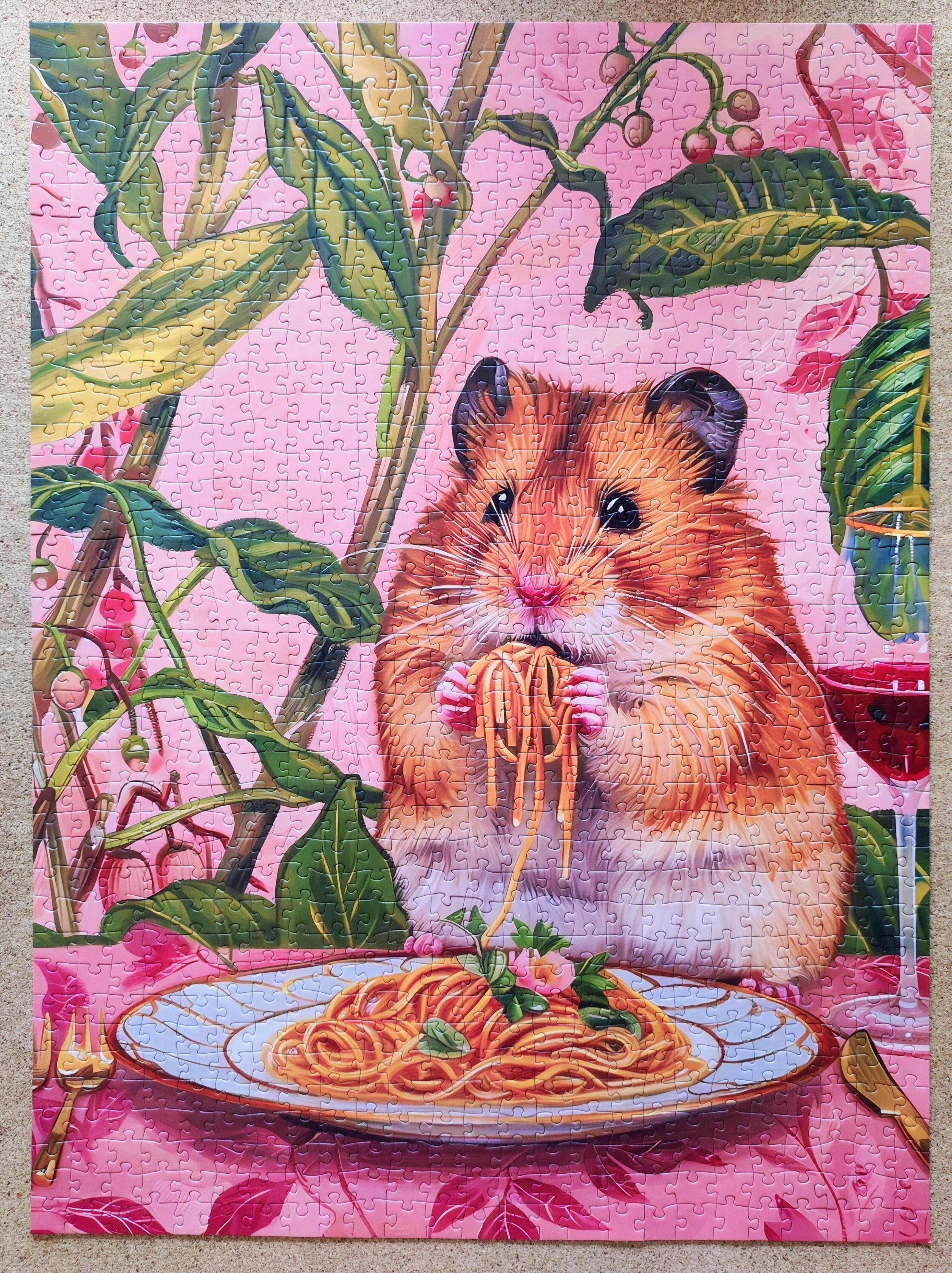 A plump little hamster has found the ultimate treat—a full plate of spaghetti just for itself. With both tiny paws holding the pasta high, it gazes at its meal with curious joy. Surrounded by leafy vines, elegant pink tablecloth, and a glass of red wine, this quirky dinner scene feels like a whimsical fusion of fine dining and playful chaos. It's a moment frozen in time, charming and slightly absurd, making every piece of the puzzle a small delight to place.