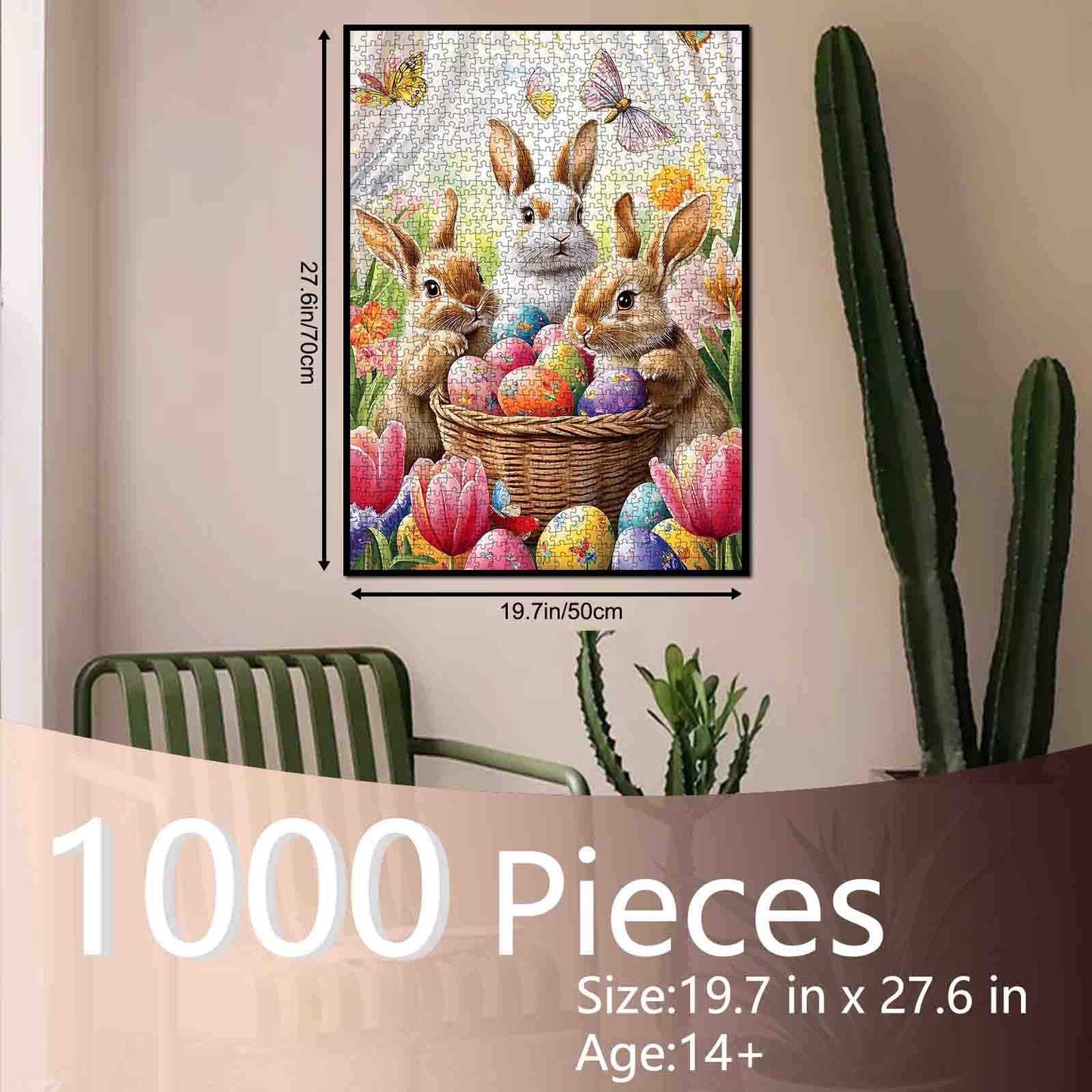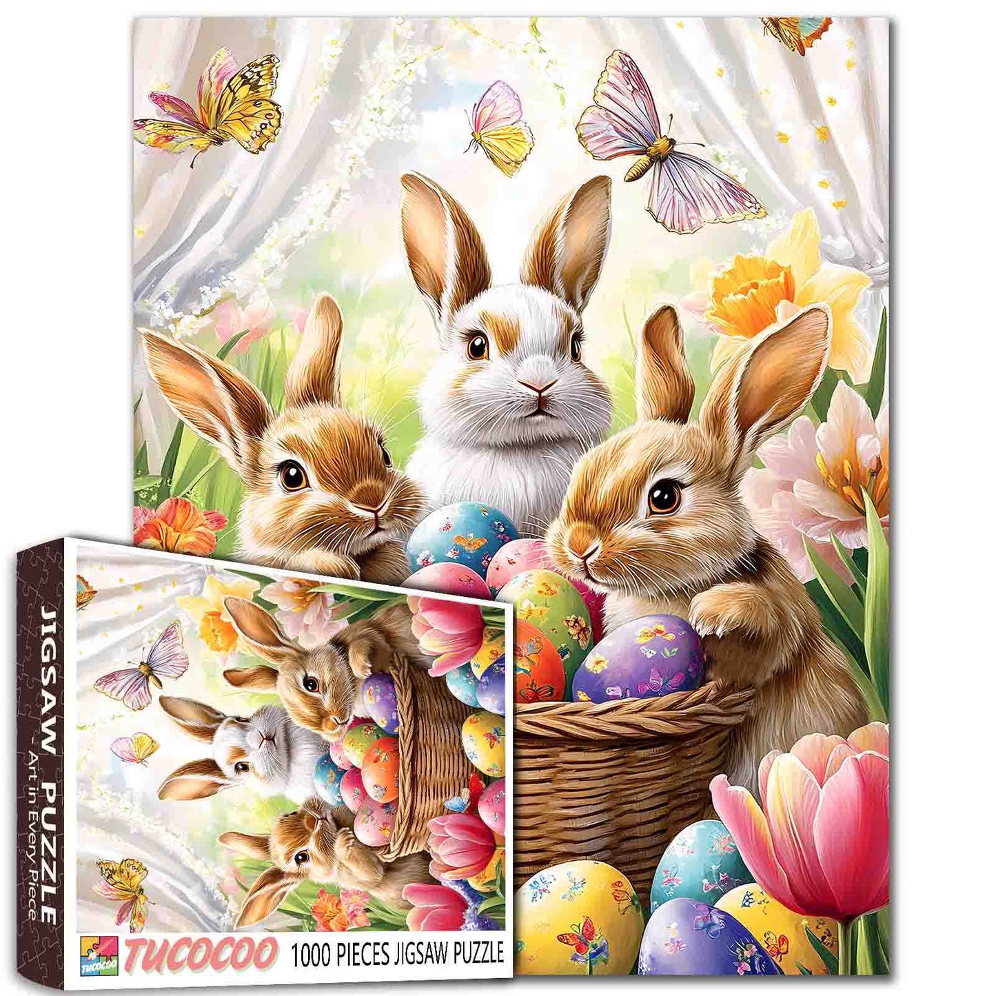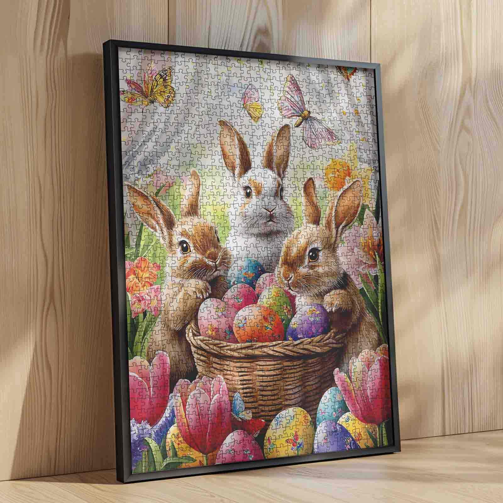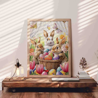 In a blooming spring garden, three adorable bunnies gather around a woven basket overflowing with brightly colored Easter eggs. Surrounded by tulips, butterflies, and daffodils, they share a moment of joyful wonder. Every detail in the scene, from the soft fur to the glowing petals, invites you to feel the freshness of the season and the innocence of the woodland friends. Perfect for bringing a touch of spring to any puzzle time.