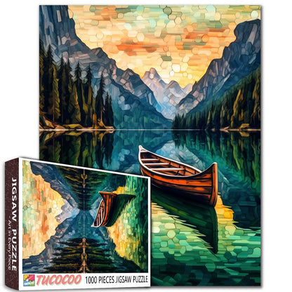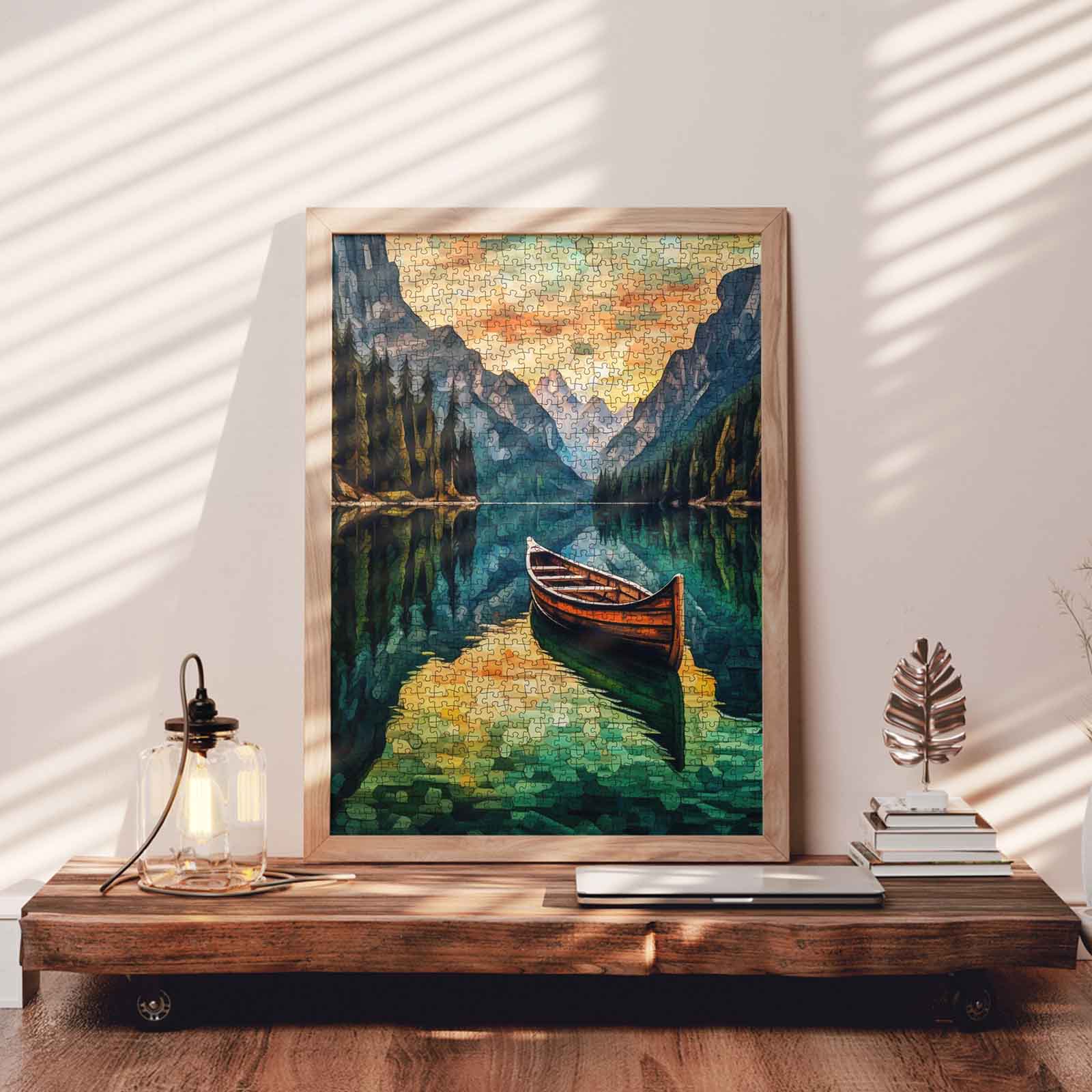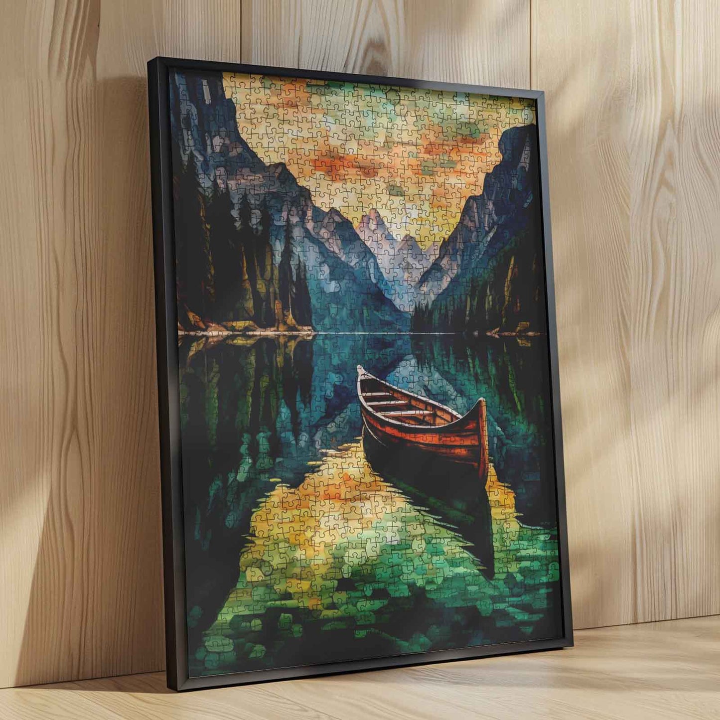 Drift into serenity with this peaceful mountain lake puzzle. A lone wooden canoe floats gently on crystal-clear waters, framed by majestic pines and snow-capped peaks. The sunset sky reflects like stained glass across the lake’s surface, casting warm tones of orange, green, and gold. Each piece brings you closer to nature’s calm, offering a quiet retreat in every fit.