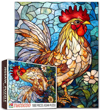 A proud rooster stands tall among blooming flowers, its feathers glowing in amber, ivory, and crimson tones. The entire image is crafted in a stained glass style, where each section mimics the shine and texture of real glass panes. Light filters through swirling blues and leafy greens in the background, framing the rooster in radiant color. The puzzle captures both rustic charm and artistic elegance, perfect for those who love animals with a splash of creativity.