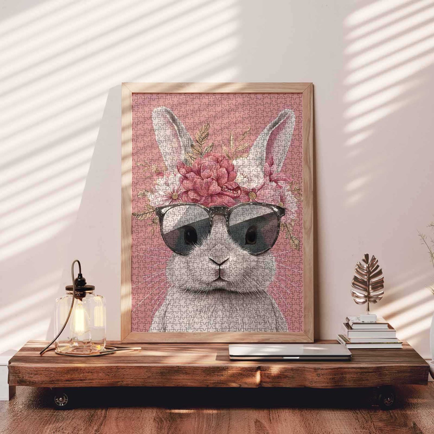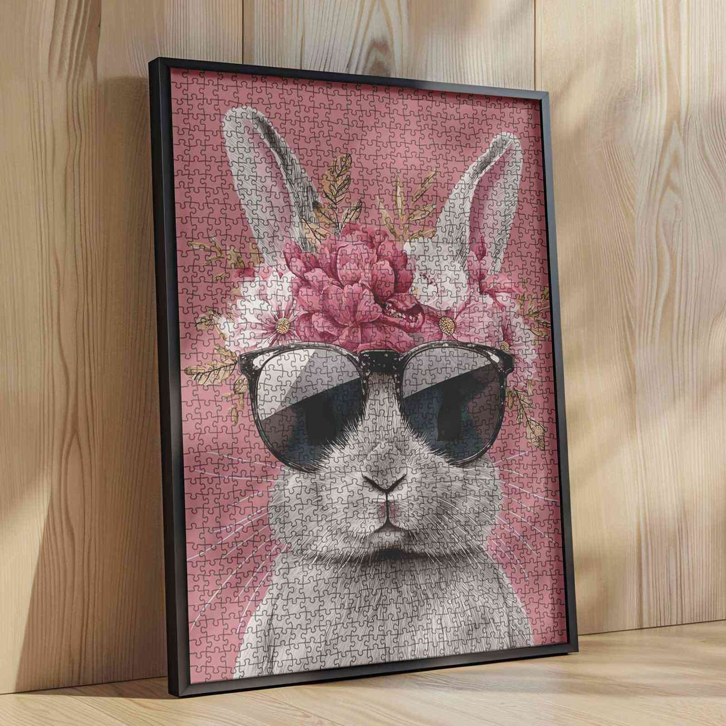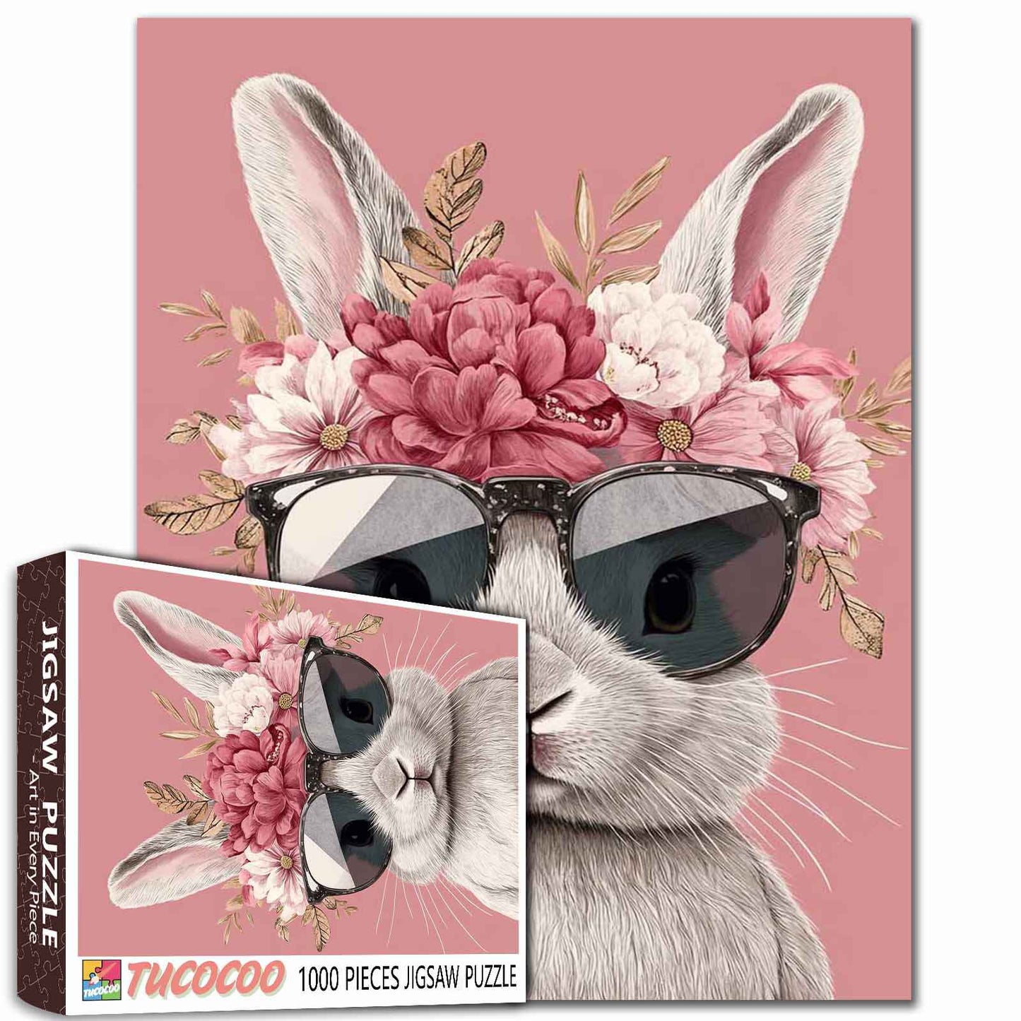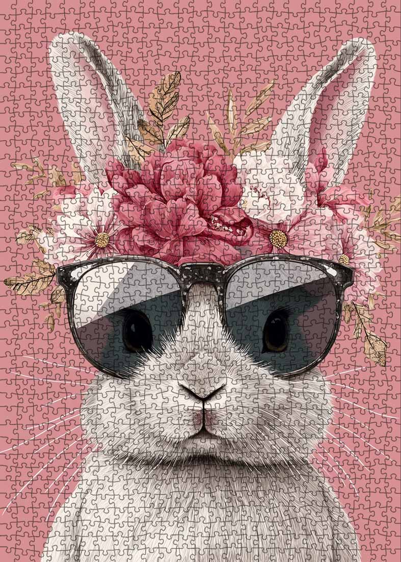 A bunny with a floral crown and sunglasses, standing proudly against a soft pink backdrop, brings a blend of elegance and playfulness. Each puzzle piece reveals more of its charming personality, creating a fun, calming experience.