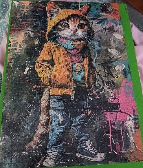 A street-smart cat rocks a yellow hoodie, graphic tee、ripped jeans, and sneakers while standing confidently against a vibrant graffiti wall. With wide eyes and cool style, this feline exudes attitude and charm. Every piece of this puzzle captures urban flair with colorful street art textures, making it a playful and edgy project for puzzle lovers who appreciate creative characters and bold design.