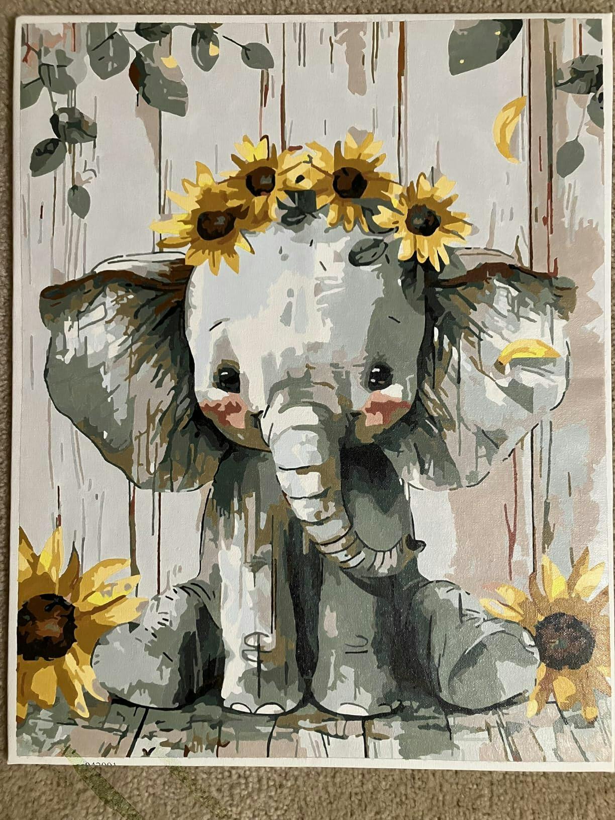 With rosy cheeks and gentle eyes, this baby elephant sits sweetly against a rustic wooden background, wearing a crown of bright yellow sunflowers. Its floppy ears and soft trunk give it a tender, innocent charm, while the scattered petals and leafy vines add a whimsical countryside feel. The delicate watercolor textures bring the whole scene to life with warmth and softness. Painting this darling elephant is a heart-melting experience, perfect for bringing joy and peace into your home or as a gift for someone special.