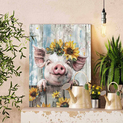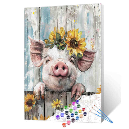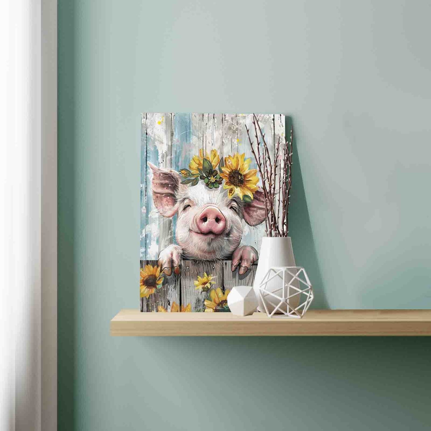 Peeking over a rustic wooden fence with a bright pink snout and the happiest grin, this little piglet radiates sunshine and charm. A crown of golden sunflowers rests atop its head, adding a whimsical touch to an already heartwarming scene. With weathered textures in the background and playful splashes of color, the image captures a perfect mix of country joy and artistic energy. Painting this cheerful piglet brings instant warmth—perfect for anyone who loves animals, flowers, and a smile that brightens the day.
