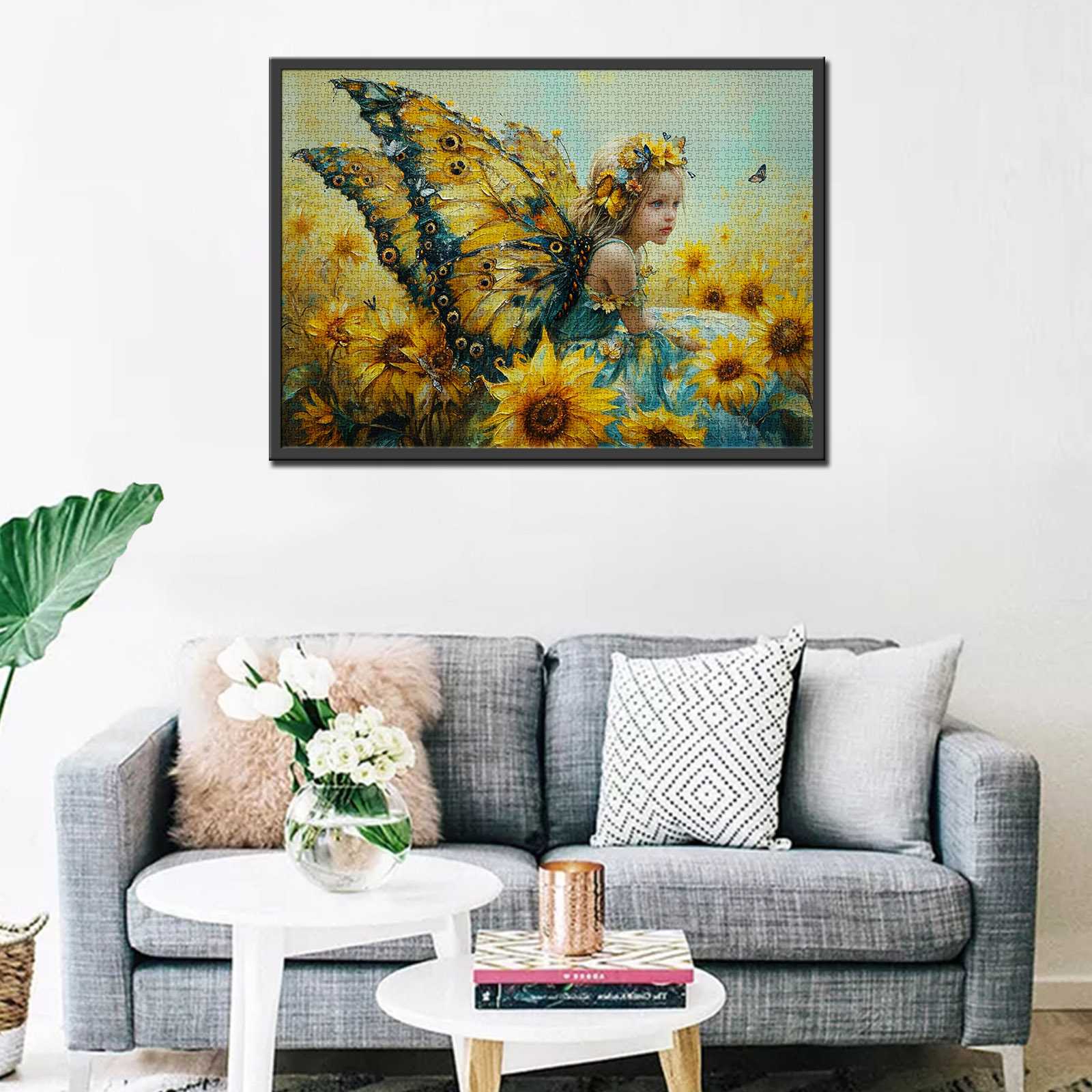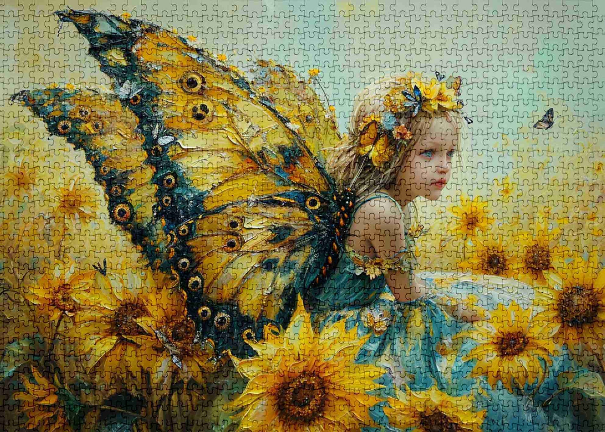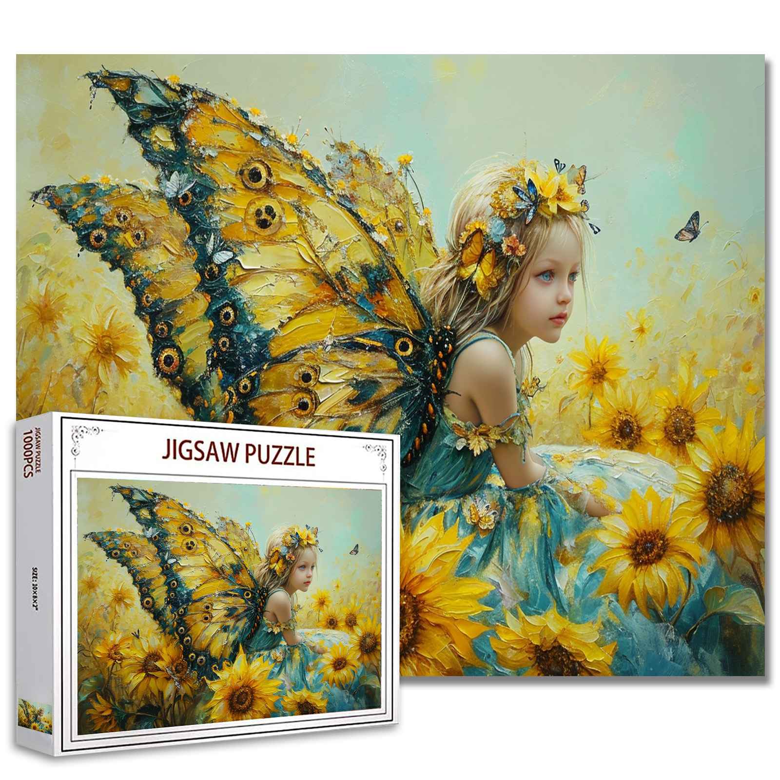 Discover the radiant beauty of our Sunflower Fairy Whispers Jigsaw Puzzle. This stunning 1000-piece puzzle features a young fairy adorned with a vibrant butterfly wing, blending perfectly into a field of blooming sunflowers. Her pensive gaze and the lively backdrop of golden petals create a captivating visual symphony of nature and whimsy. This puzzle is ideal for those who delight in the magic of summer gardens and the enchanting allure of fairies, offering an immersive experience in both artistry and theme.
