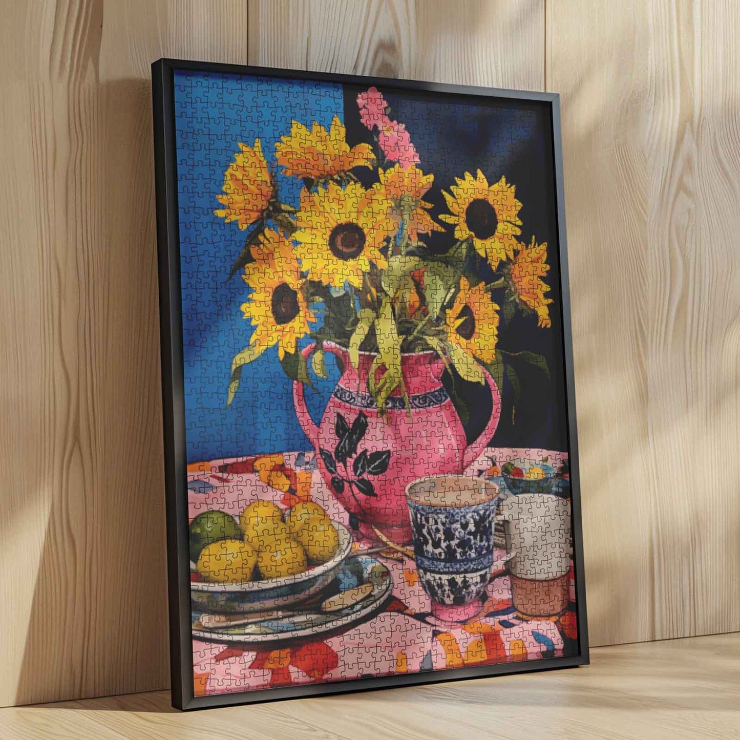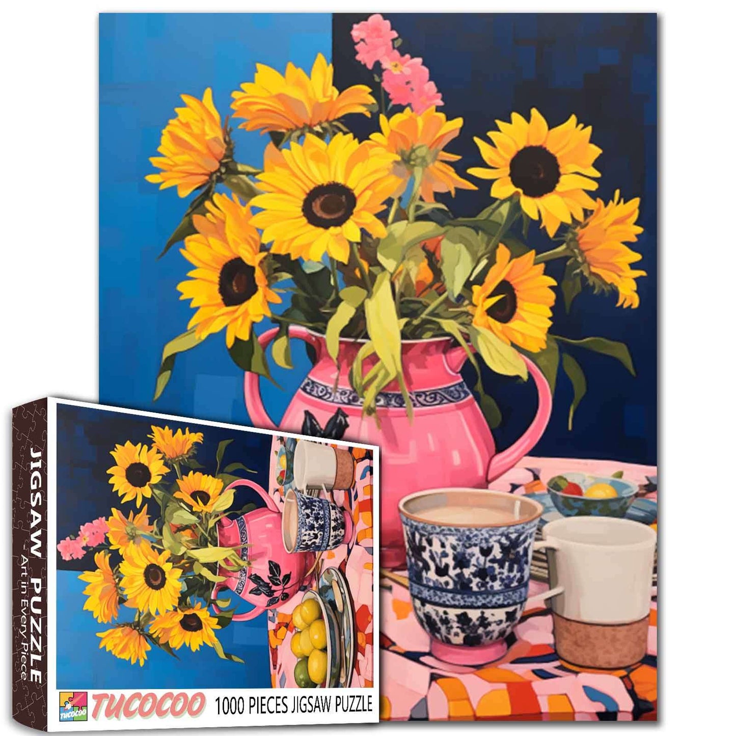 A cheerful bouquet of sunflowers bursts from a vibrant pink teapot, surrounded by patterned cups and a colorful tablecloth. The lively blue background deepens the joyful contrast, making the scene feel like a cozy breakfast in a sunlit kitchen. Each piece brings to life the warmth of home, the simple pleasures, and the promise of a bright day ahead.