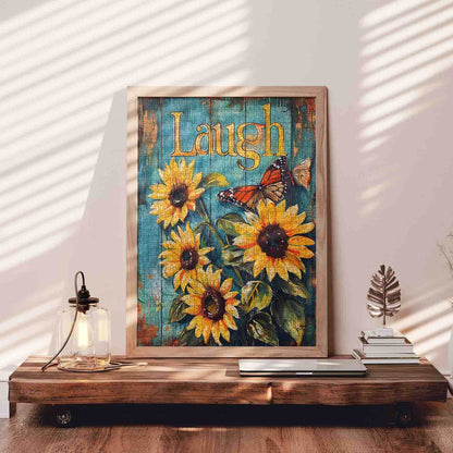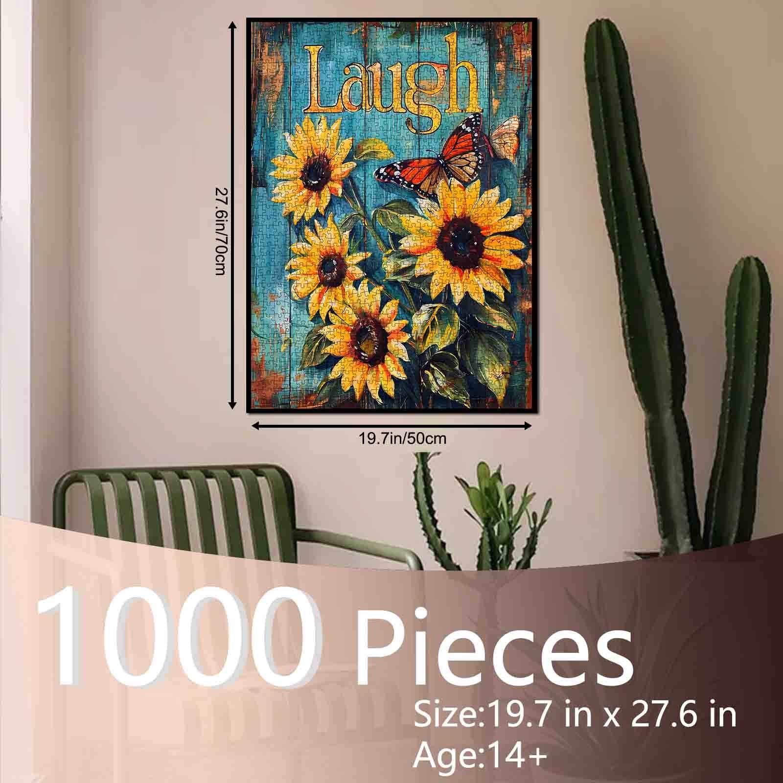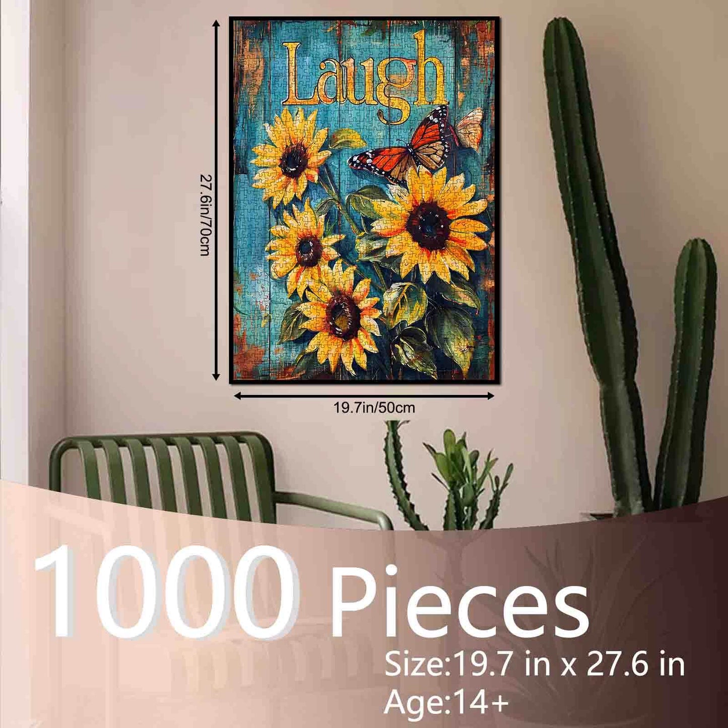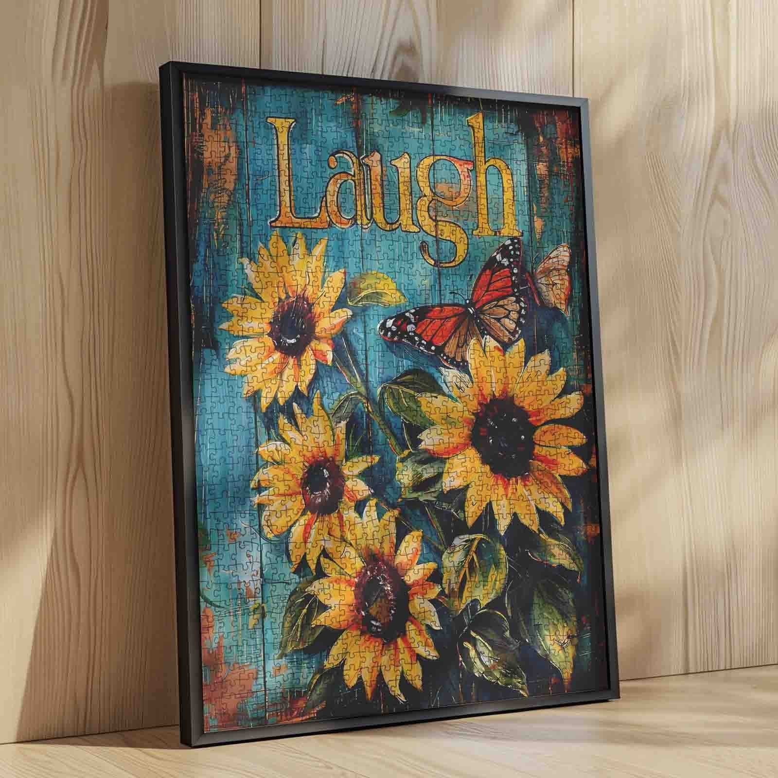A cluster of golden sunflowers stretches joyfully toward the sun, while a monarch butterfly flutters gently above, adding a spark of life to the rustic teal backdrop. The word "Laugh" sits boldly above, reminding us to embrace joy in simple moments. Weathered wood texture and warm tones give the scene a cozy countryside charm. Piece by piece, this puzzle brings a smile and a reminder to slow down and appreciate small beauty.