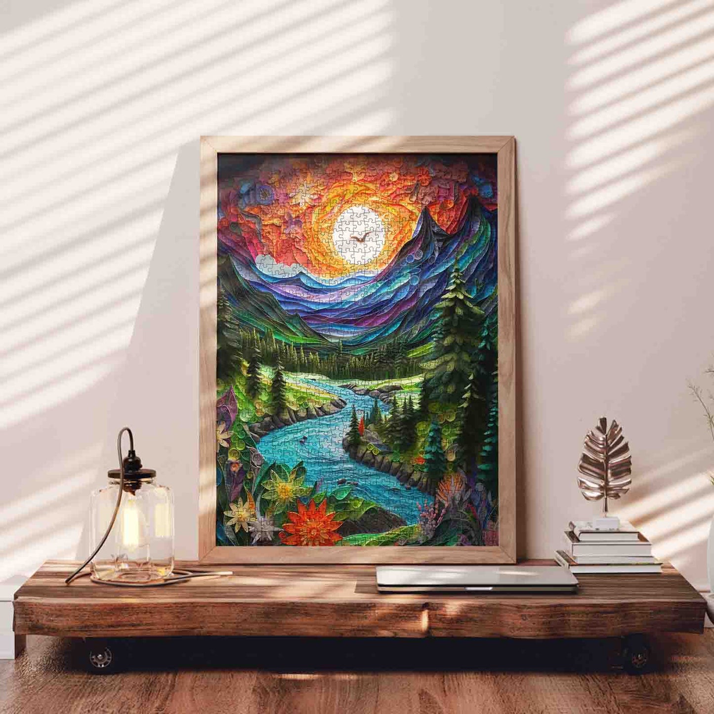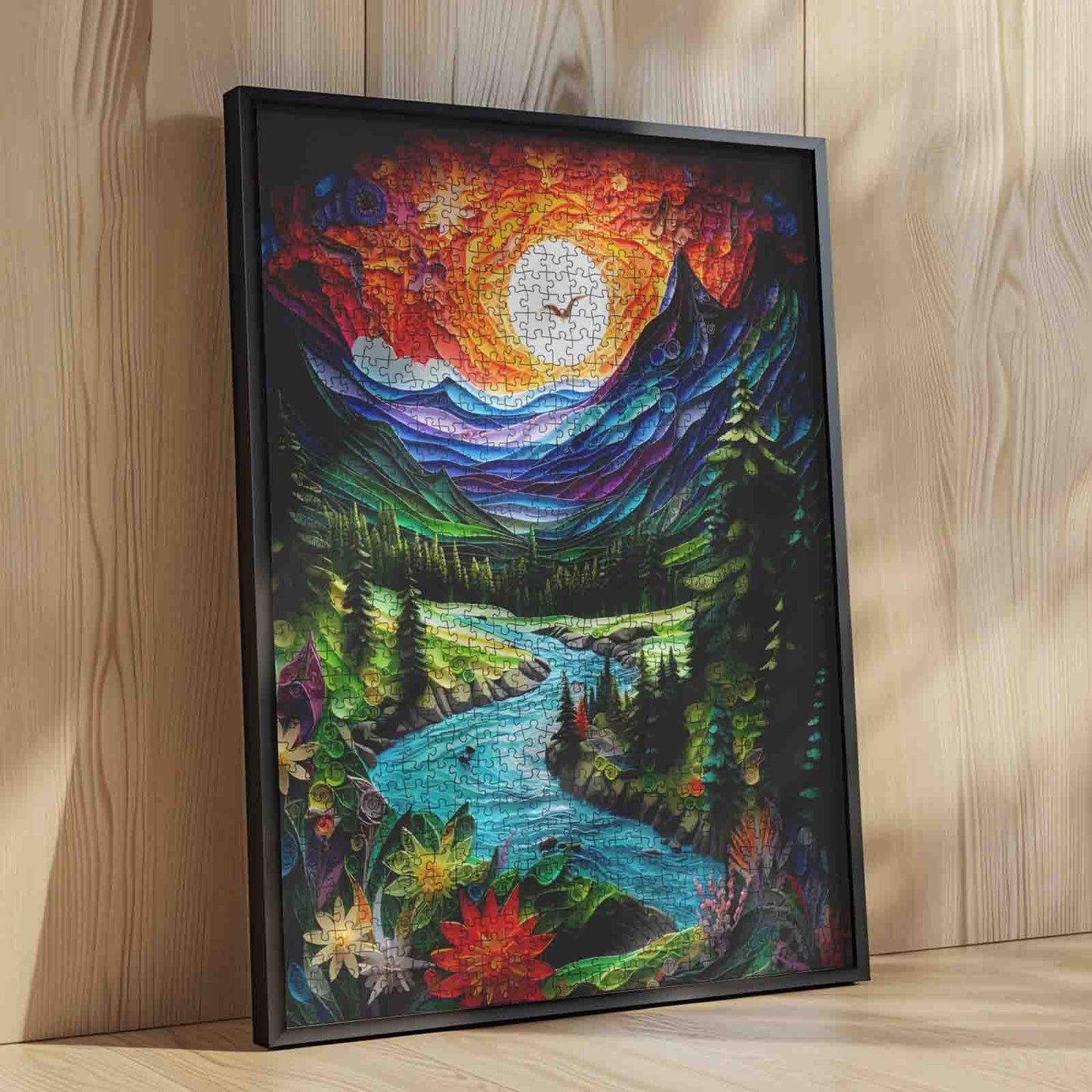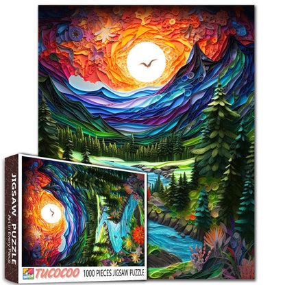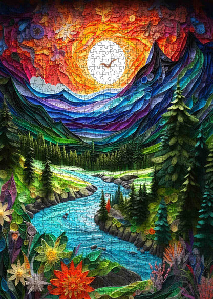 A radiant sunset fills the sky with swirls of orange, red, and gold as a crystal-clear river winds through a lush green valley. Towering pine trees stand along the banks, while vibrant wildflowers bloom in the foreground, each petal crafted in intricate, quilled detail. Majestic mountains rise under the glowing sky, creating a dramatic backdrop for the peaceful waterway. As you piece together this vivid landscape, you’ll feel the warmth of the sun, the cool flow of the river, and the serene beauty of nature’s embrace—a journey for every puzzle lover.