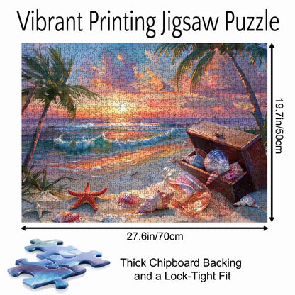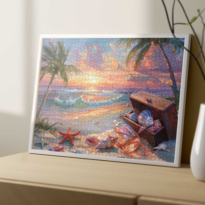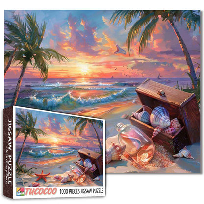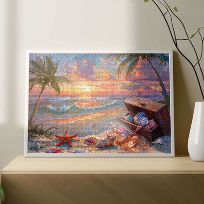 Waves gently lap the shore as the sun sets in a blaze of color, casting golden light across the sand. Seashells spill from an open treasure chest, scattered beside a glass bottle and starfish. Palm trees lean into the breeze, framing the scene like nature’s perfect painting. The sky glows with hues of orange, pink, and purple, reflected in the surf and tide. Completing this puzzle is like stepping into a tranquil island evening, where every piece carries the whisper of salt air and the rhythm of the ocean.