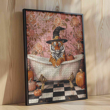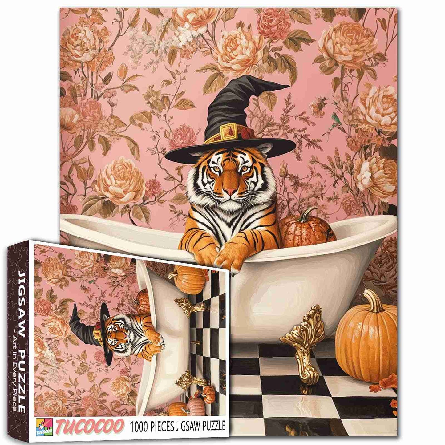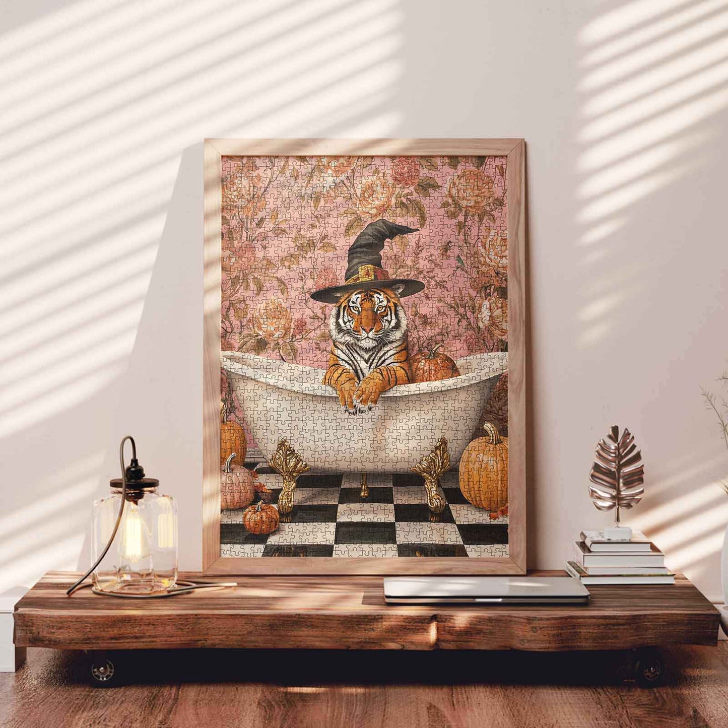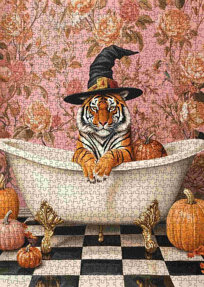Against a blooming floral wallpaper, a majestic tiger lounges in an elegant clawfoot bathtub, wearing a playful witch hat. Pumpkins are scattered around the black-and-white tiled floor, adding a whimsical autumn touch. Every piece captures the surprising harmony between wild spirit and cozy charm.