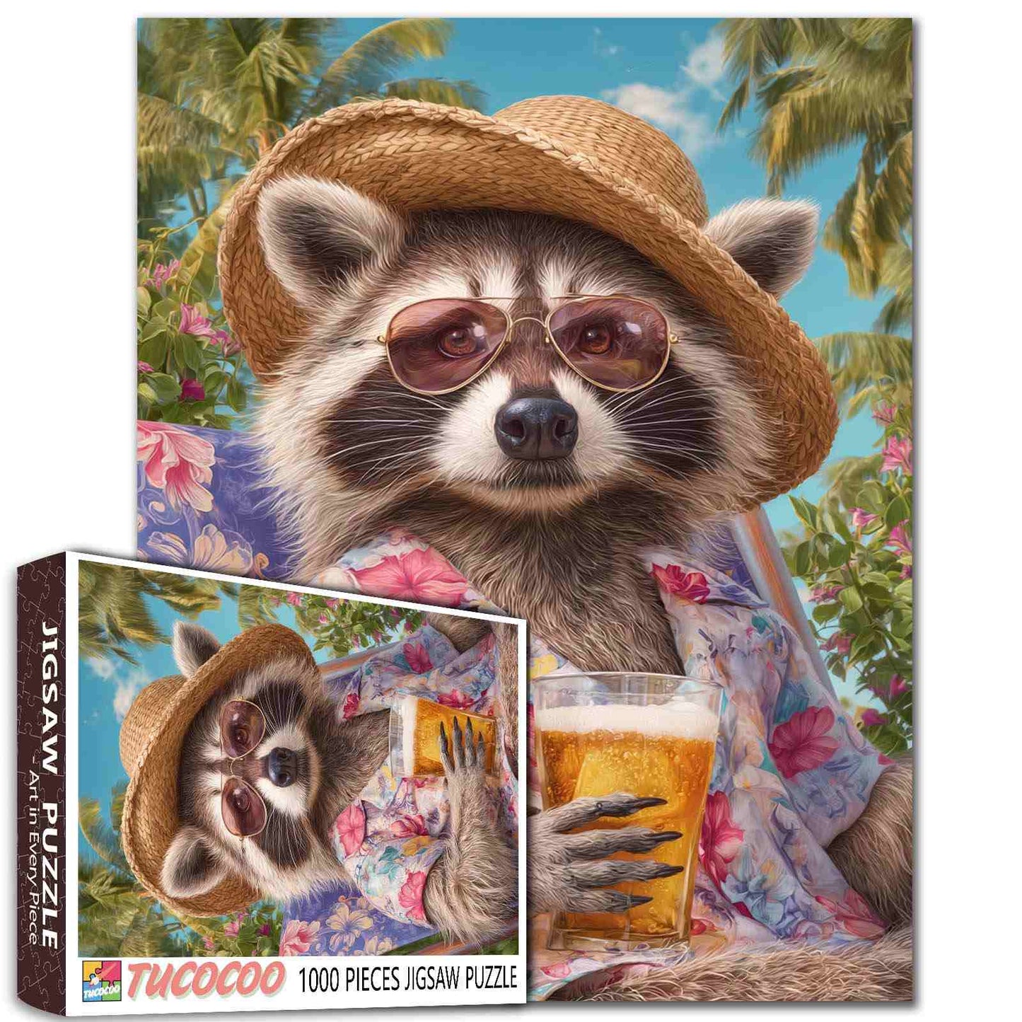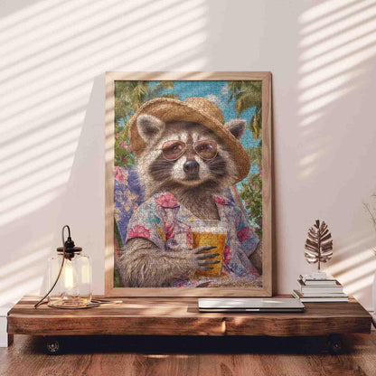 A laid-back raccoon lounges in a deck chair, dressed in a colorful Hawaiian shirt, straw hat, and stylish sunglasses. With a cold drink in hand, this furry vacationer enjoys the sunshine and tropical vibes, surrounded by palm trees and blooming flowers. The playful scene is full of summer cheer, capturing the spirit of relaxation and fun. Each piece adds to the lighthearted mood, perfect for puzzle fans who love animals, holidays, and a touch of humor in their collections.