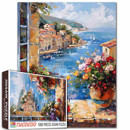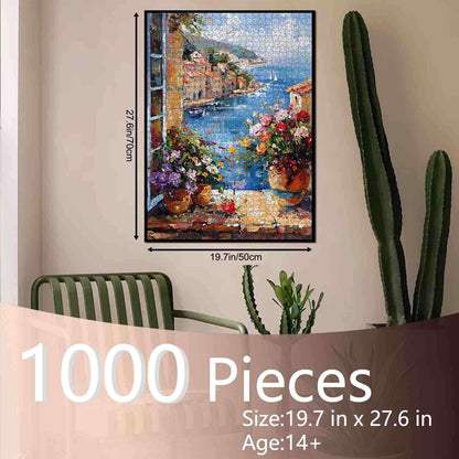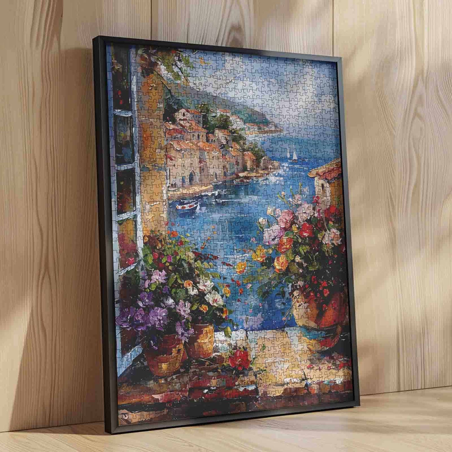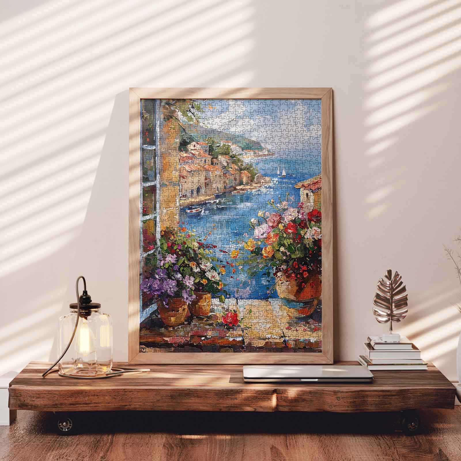 Sunlight pours through a charming window framing a colorful Mediterranean town, where terracotta rooftops and flower pots bask under the coastal breeze. Sailboats gently drift in the azure sea, while fresh blooms in the foreground seem to dance in the warm air. Every piece of this puzzle draws you into a timeless escape—one that brings the serenity of seaside life into your hands.