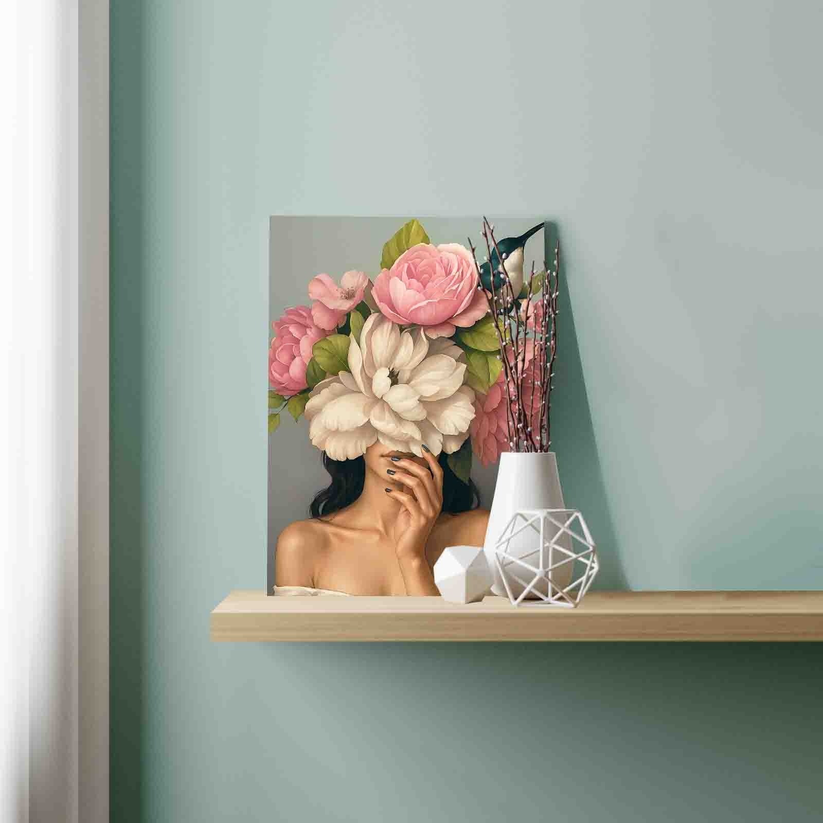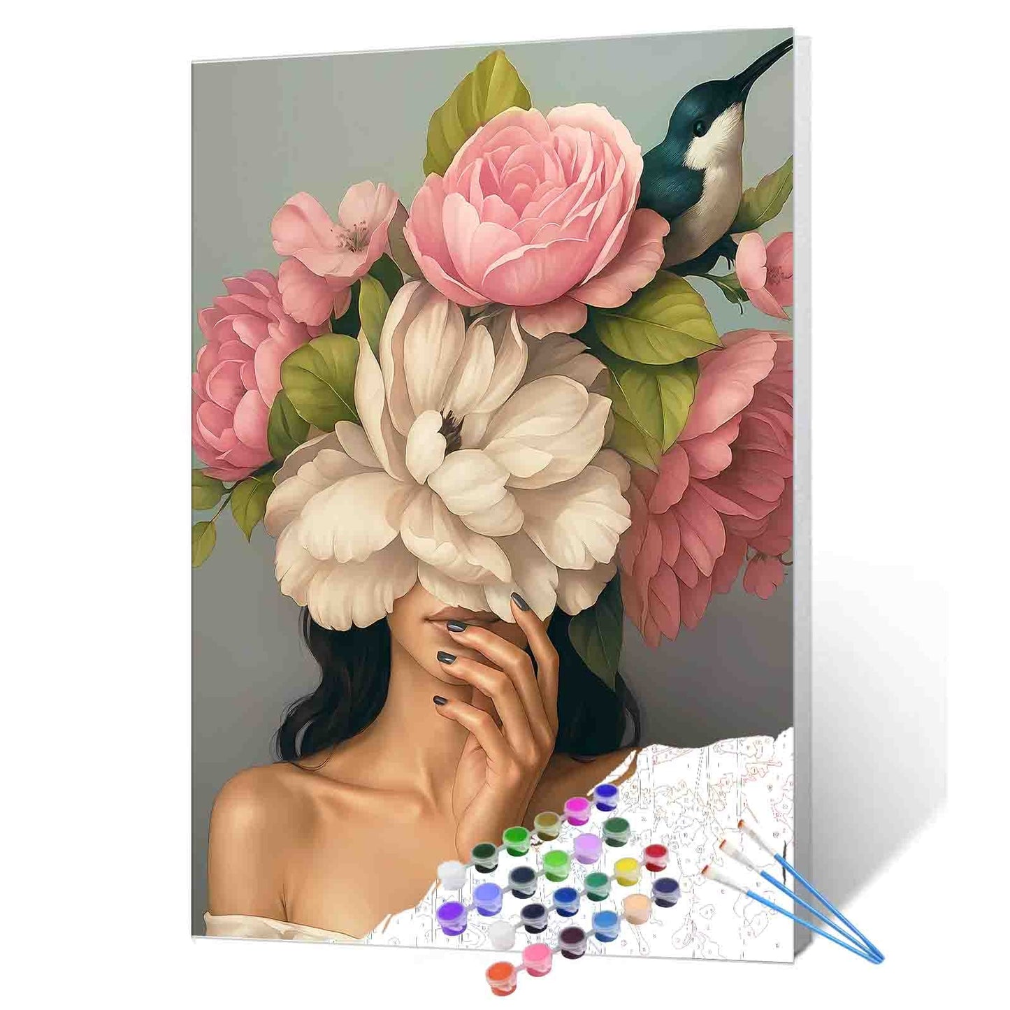 A graceful woman stands with her face hidden behind a crown of blooming peonies, their soft pink and ivory petals full of gentle curves and delicate beauty. Nestled among the blossoms, a small bird perches quietly, adding a touch of liveliness and freedom to the serene composition. Her hand, raised gracefully near her lips, and her bare shoulders suggest a moment of stillness and introspection. The elegant color palette and soft background create a scene that is both poetic and modern. Painting this artwork offers a soothing, mindful experience—perfect for those who love the harmony of nature and feminine charm.